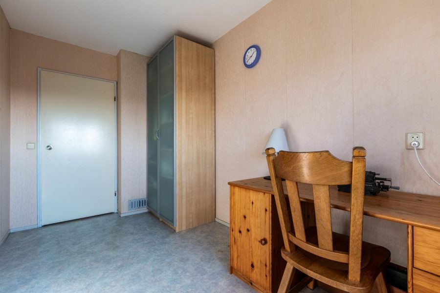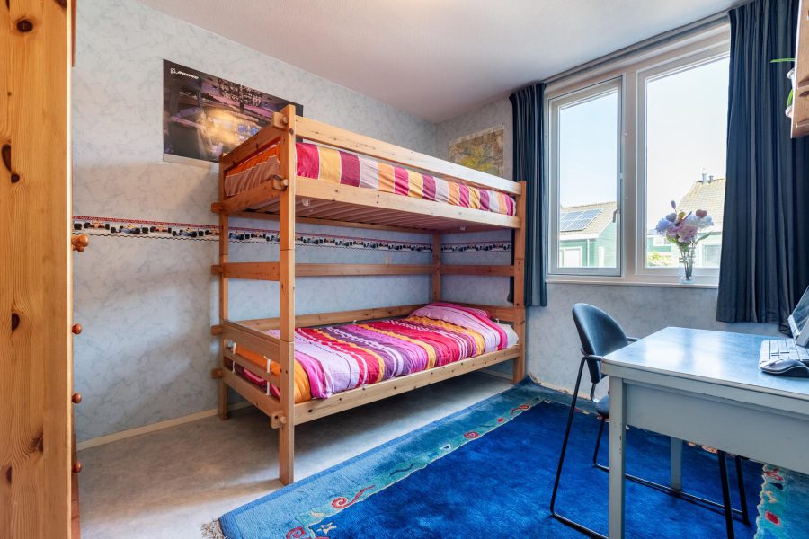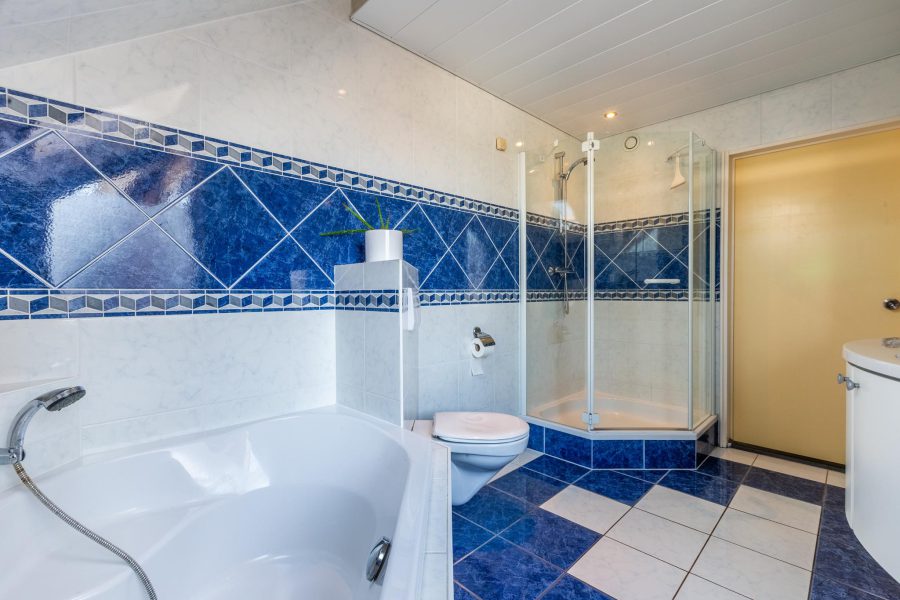 Via de gestoffeerde trap bereiken we de overloop van deze verdieping. Hier treffen we drie slaapkamers en de ruime badkamer aan. Twee slaapkamers liggen aan de achterzijde en de derde slaapkamer ligt aan de voorzijde, naast de badkamer. Alle kamers zijn netjes afgewerkt en hebben een mooie lichtinval. De ruime badkamer is voorzien van een badmeubel met dubbele wastafel en spiegelkasten, een hoekligbad en een hoekdouchecabine.