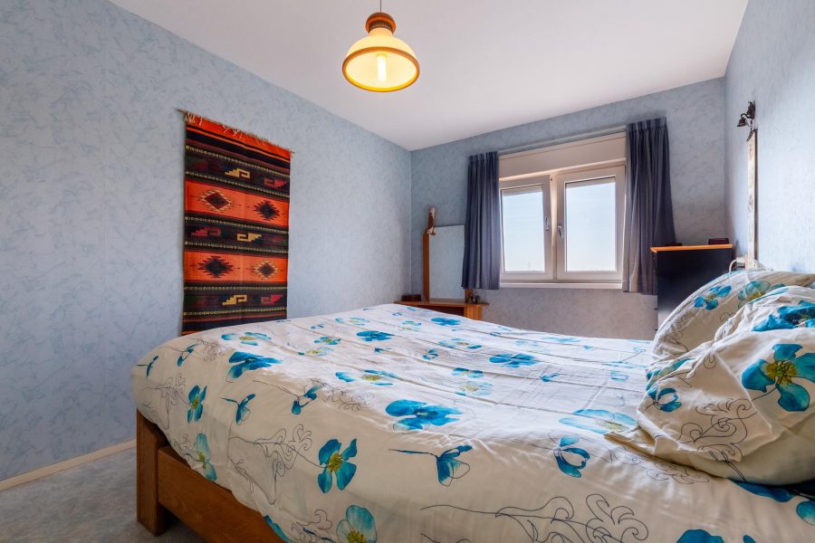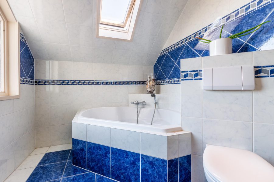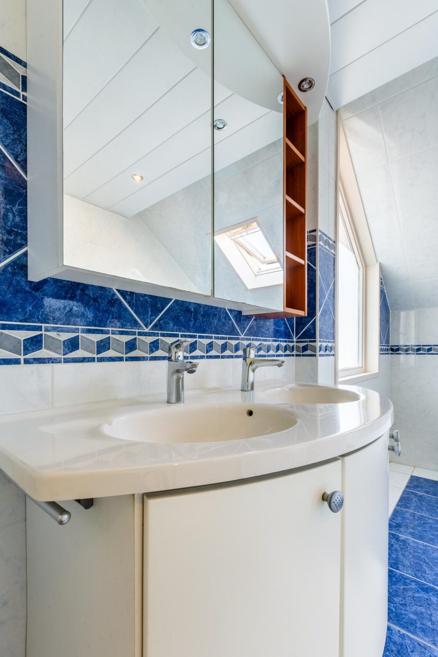 Via the upholstered stairs we reach the landing of this floor. Here we find three bedrooms and the spacious bathroom. Two bedrooms are at the rear and the third bedroom is at the front, next to the bathroom. All rooms are nicely finished and have a nice light. The spacious bathroom is fitted with a vanity unit with double sinks and mirrored cabinets, a corner bathtub and a corner shower cabin.
