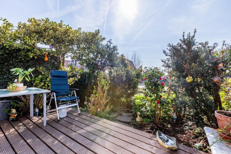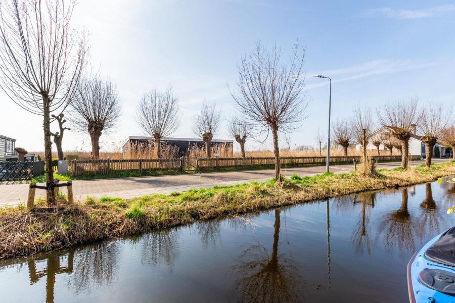 De woning heeft een voortuin en een achtertuin gelegen aan open vaarwater. Hier vaar je met een kano zo het water op en mocht het vriezen kun je hier zo het ijs opstappen. De tuin heeft een houten vlonder aan het water met vrij uitzicht over een landelijke omgeving. Je kunt hier een heerlijke loungeplek realiseren. Aan de woning vast bevindt zich een zonnescherm, zodat je ook altijd een plekje in de schaduw kunt vinden.