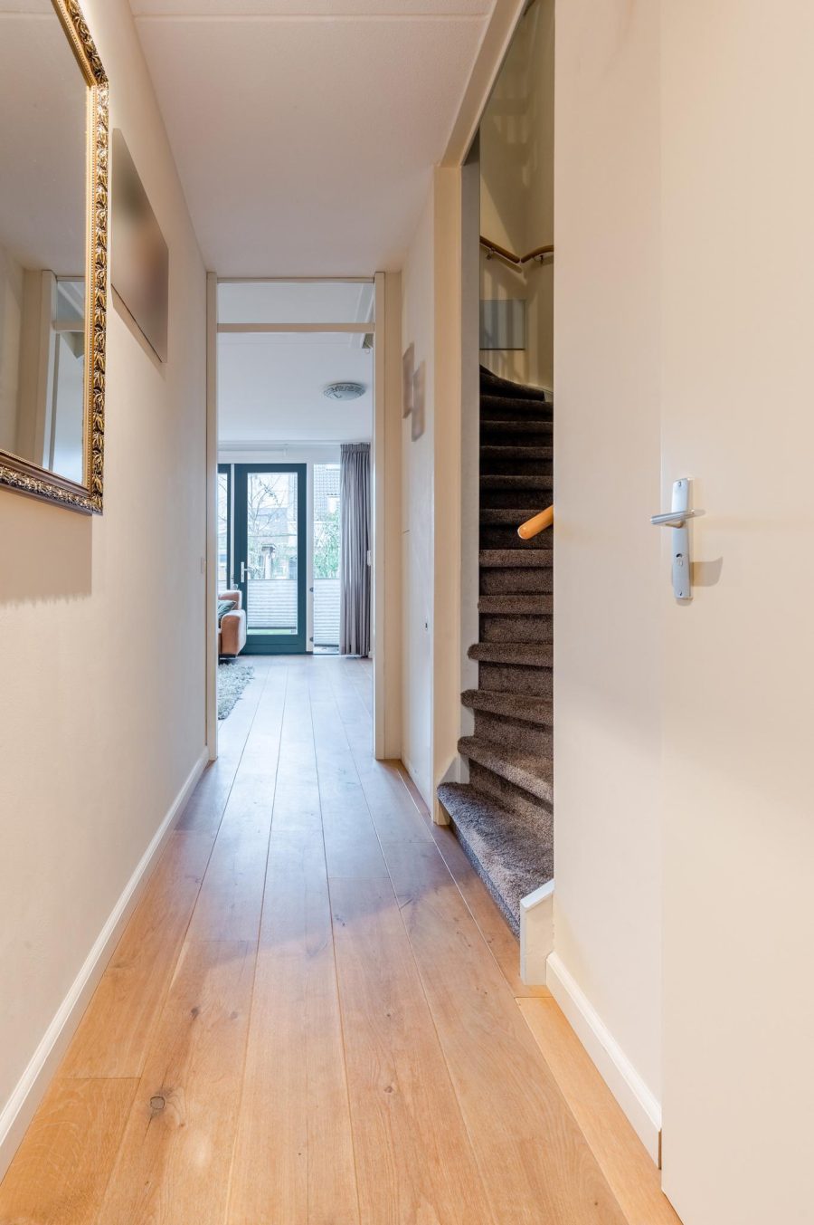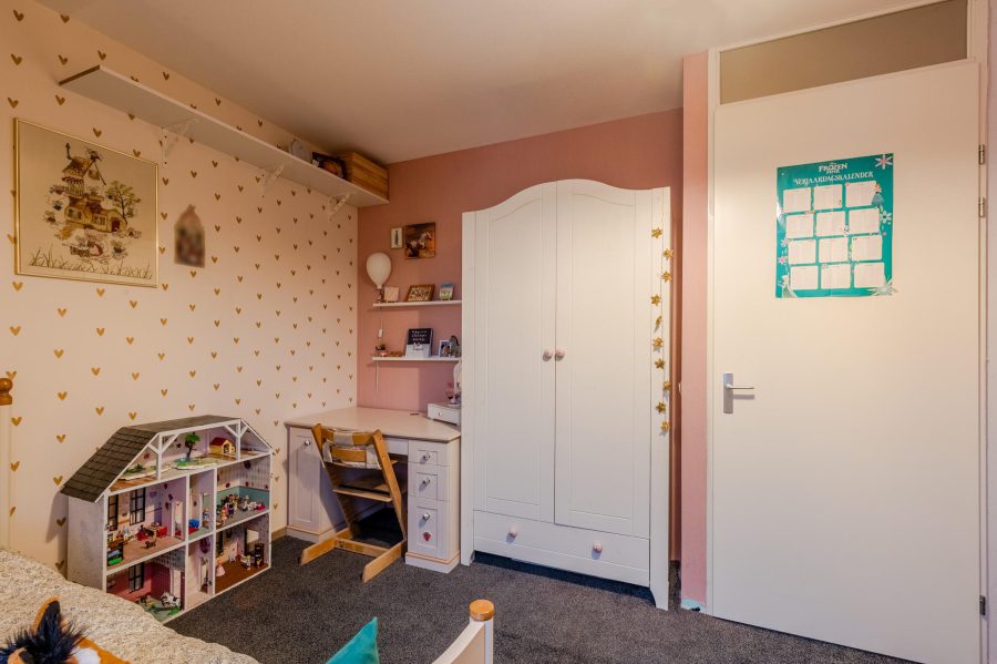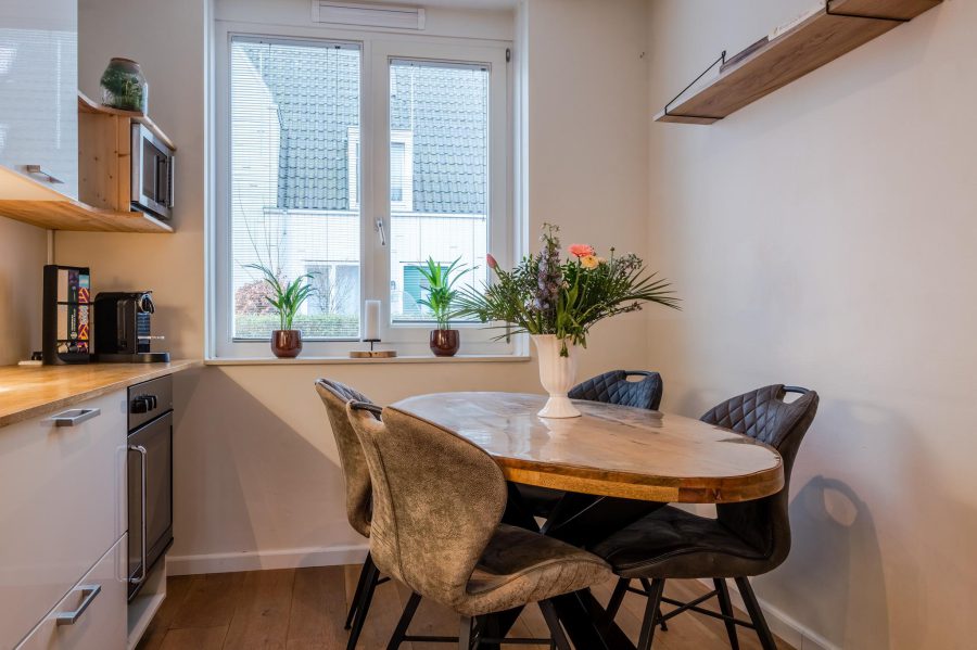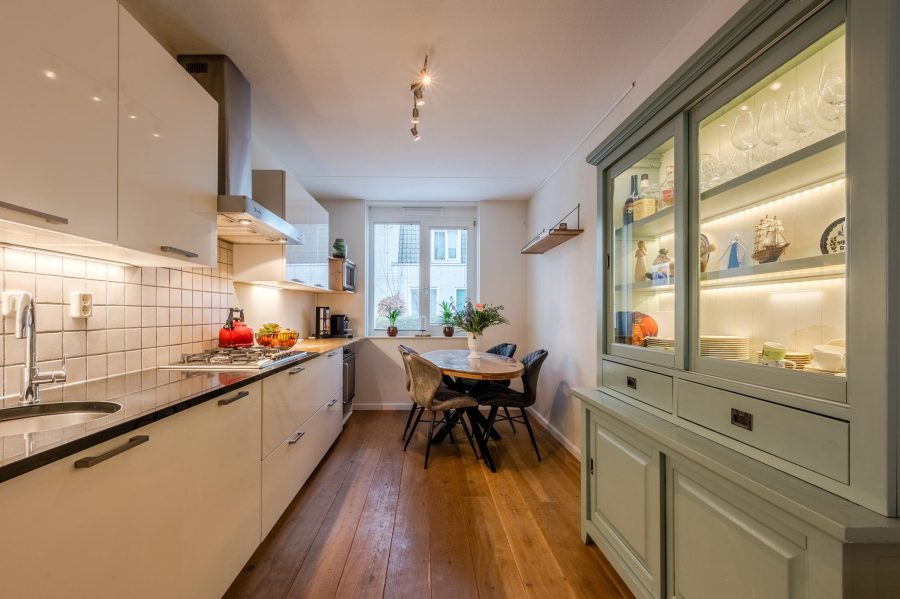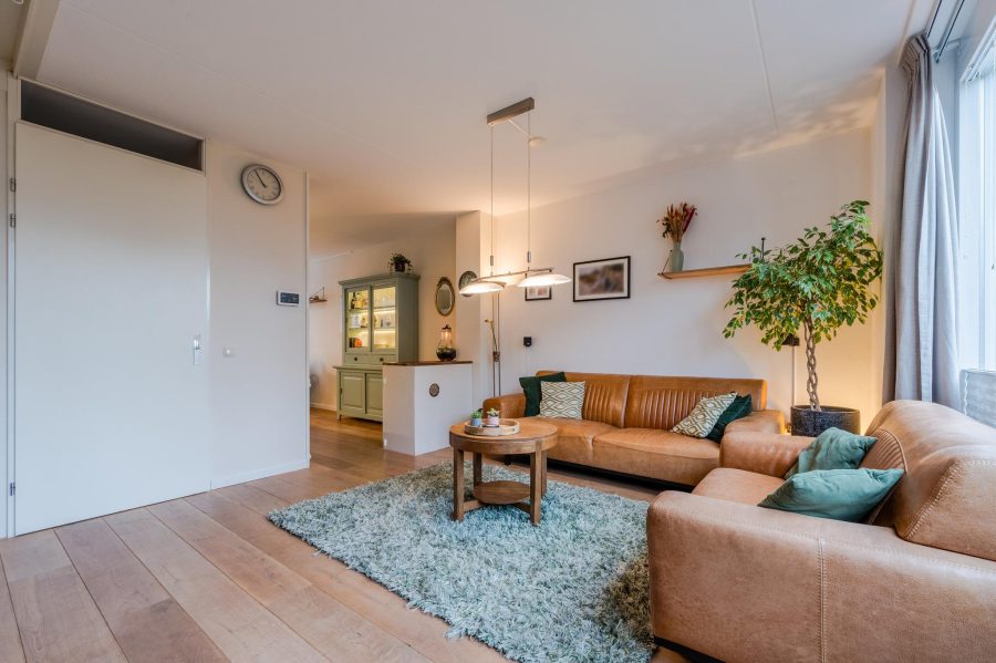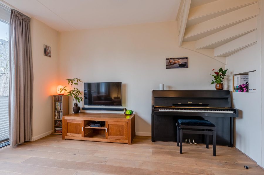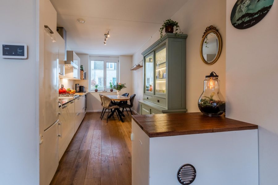 Through the tiled front garden with green hedge, we reach the front door of the house. Entrance with meter closet and wardrobe, floating toilet with hand basin, staircase to the first floor, stairs closet and access to the living room. The bright, garden-oriented living room has a wide window at the back with French doors to the garden. At the front you will find the straight kitchen. The kitchen has white fronts and is equipped with various built-in appliances, including a dishwasher (2024), a fridge and a gas cooker (2023). The kitchen is spacious enough to fit a dining table On the ground floor are wooden floorboards with underfloor heating underneath.