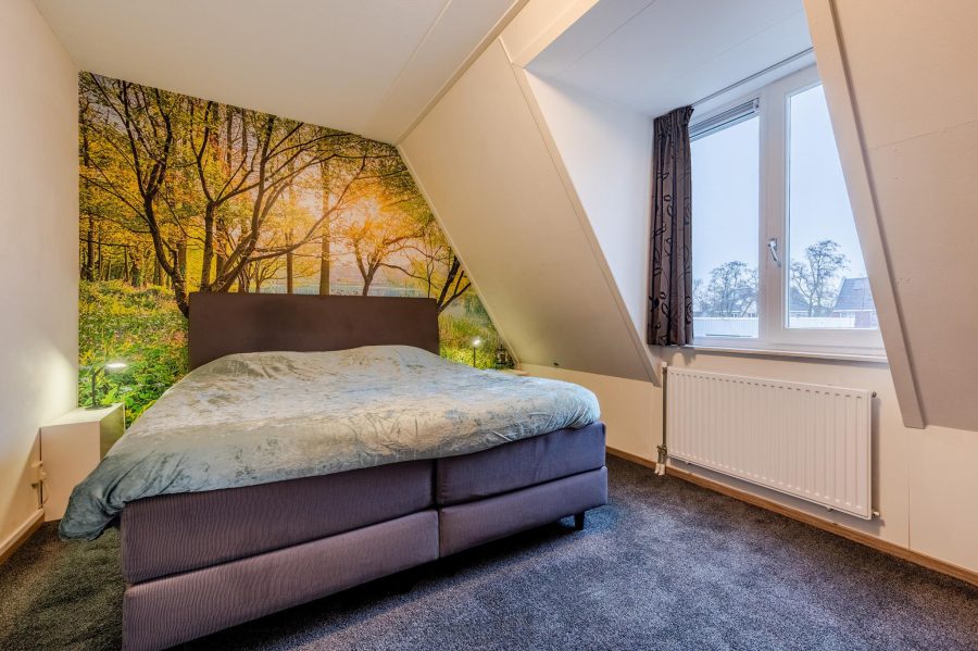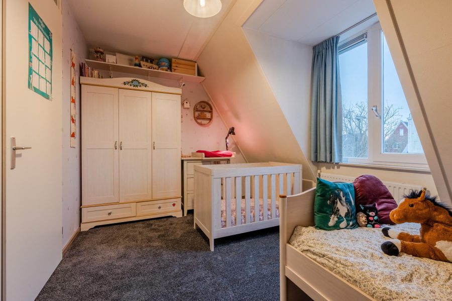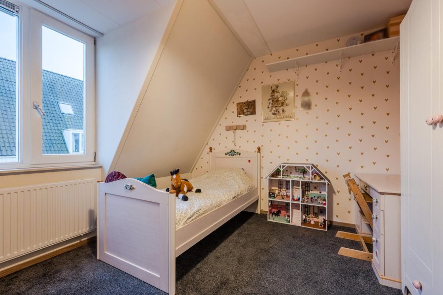 Via de gestoffeerde trap bereiken we de overloop van deze verdieping. Deze verdieping heeft zowel voor als achter een dakkapel. Hier tref je twee slaapkamers en de badkamer aan. Eén slaapkamer ligt aan de achterzijde en de tweede slaapkamer aan de voorzijde. Beide kamers zijn netjes afgewerkt en op de vloer ligt tapijt. De tot aan het plafond betegelde badkamer is voorzien van een badmeubel met brede wastafel en spiegel, een zwevend toilet en een douchecabine.