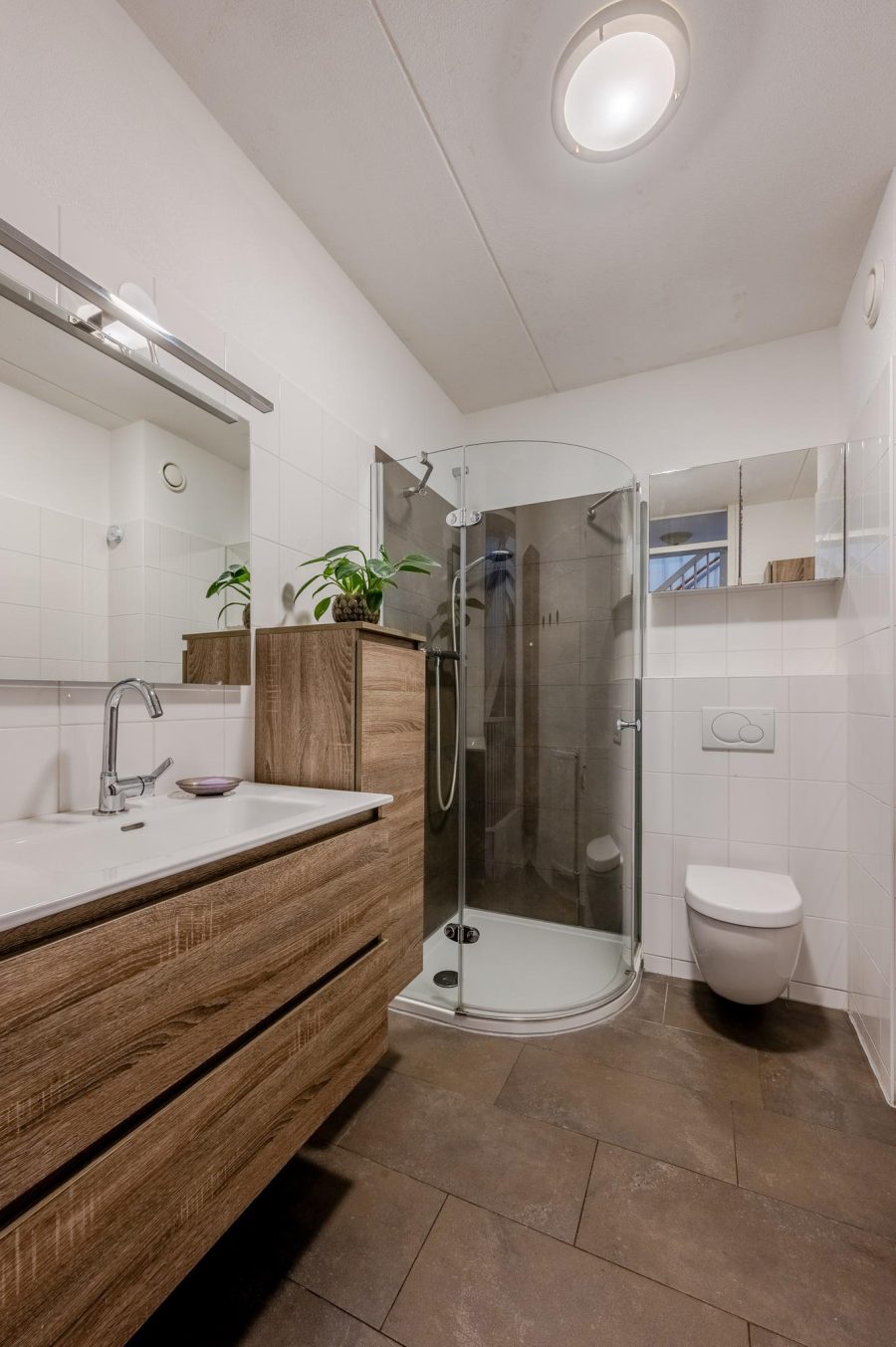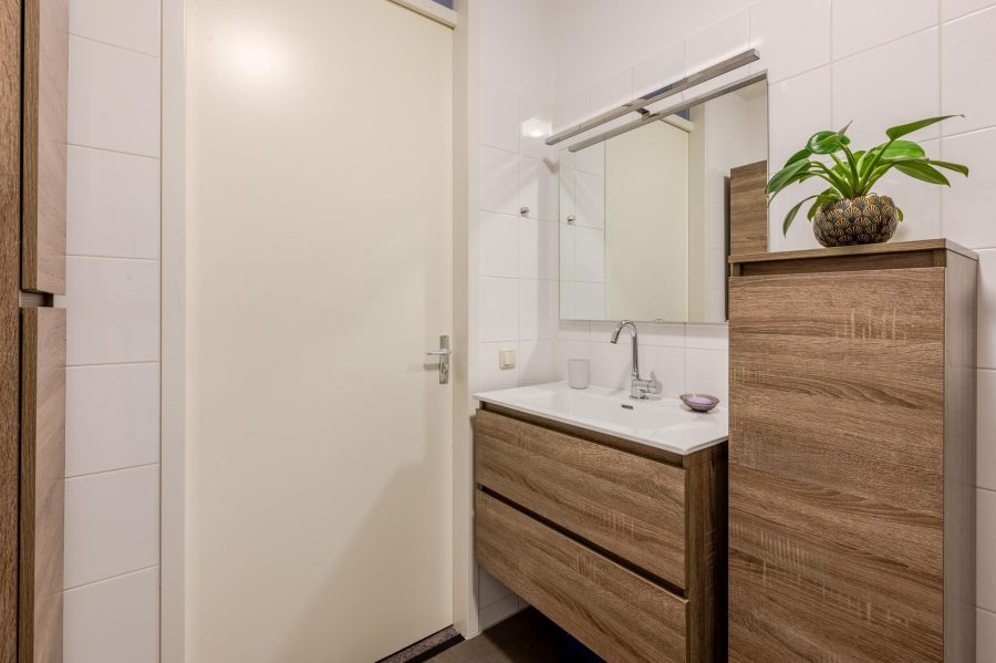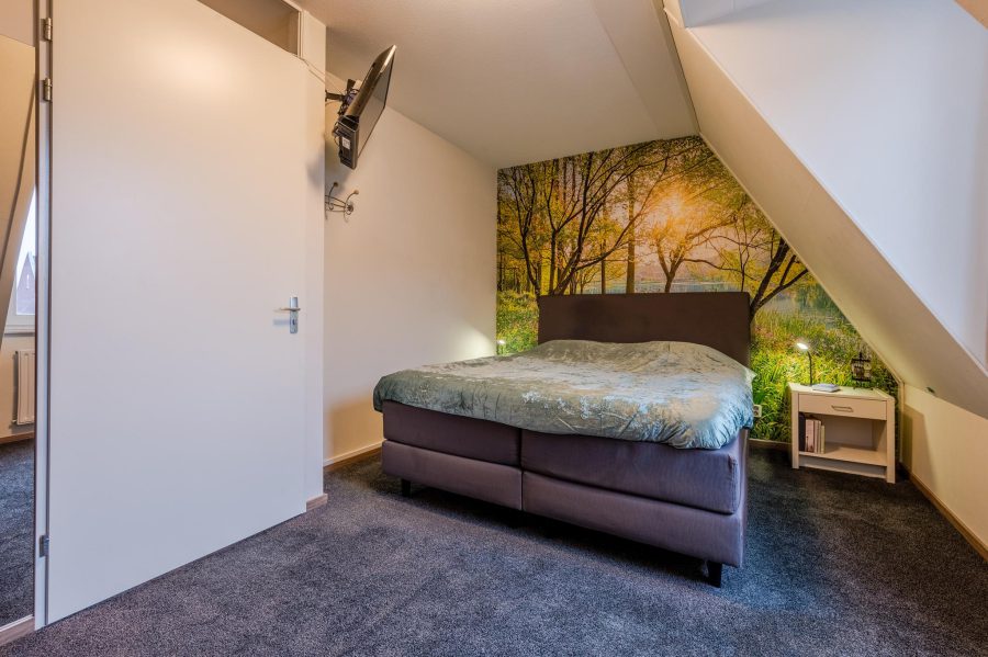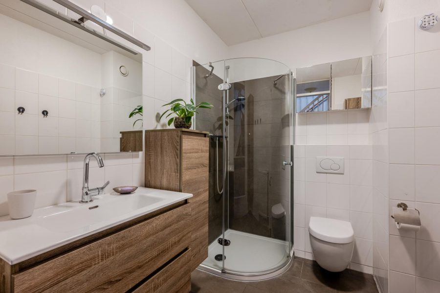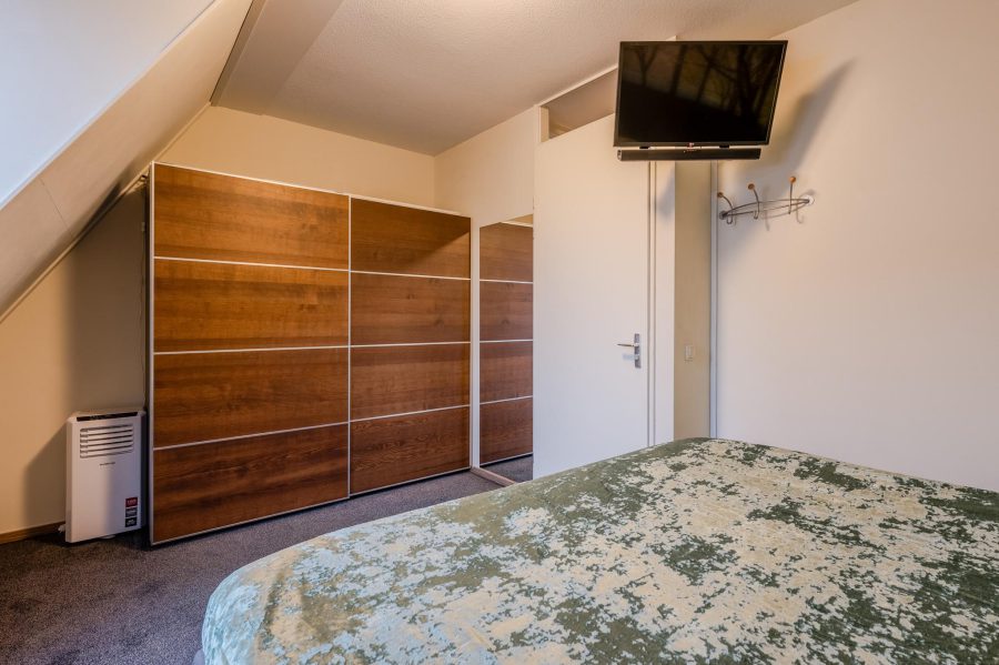 Via the upholstered staircase, we reach the landing of this floor. This floor has both front and rear dormer windows. Here you will find two bedrooms and the bathroom. One bedroom is located at the rear and the second bedroom at the front. Both rooms are nicely finished and the floor is carpeted. The ceiling-tiled bathroom has a vanity unit with wide washbasin and mirror, a floating toilet and a shower cubicle.