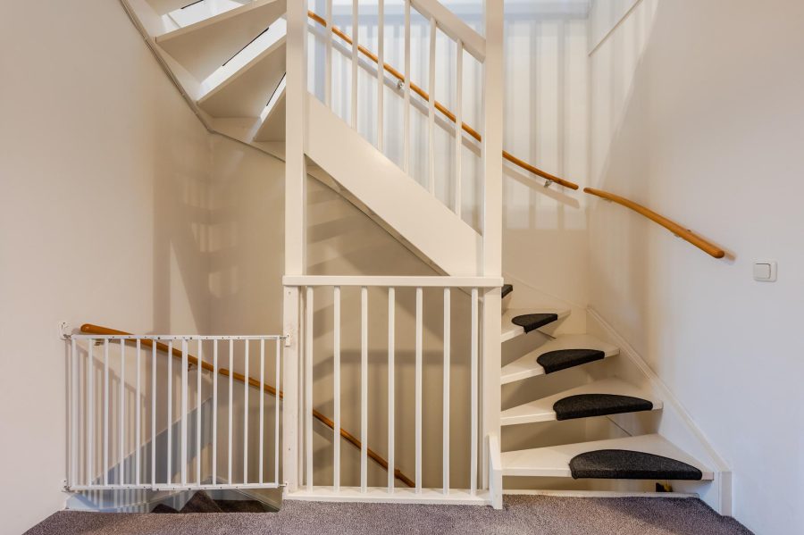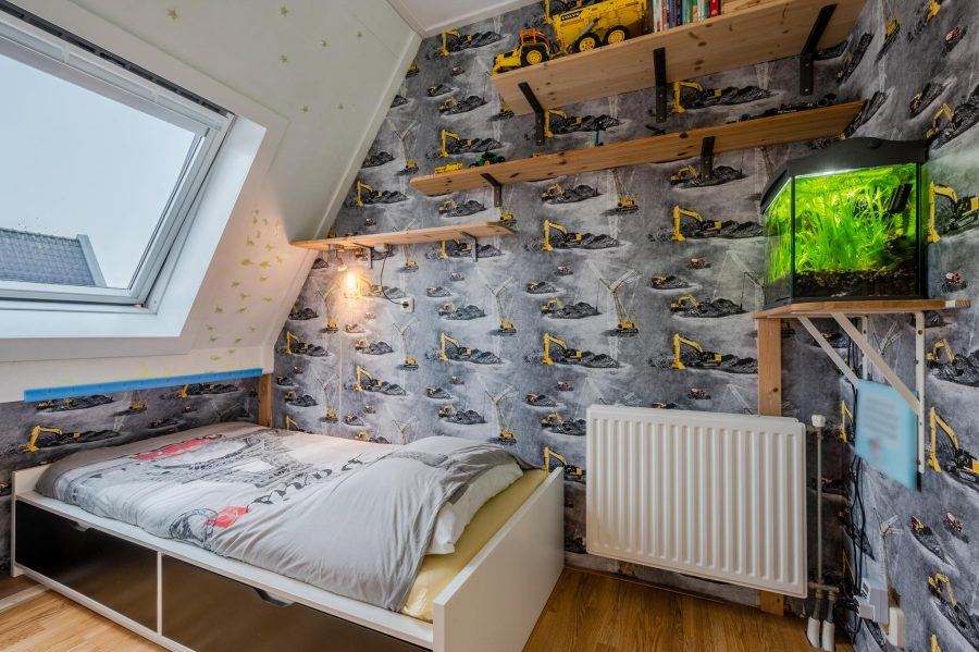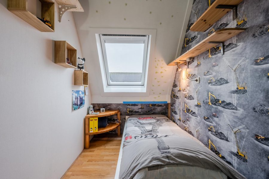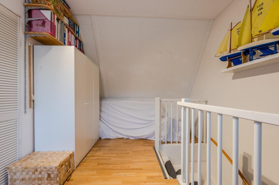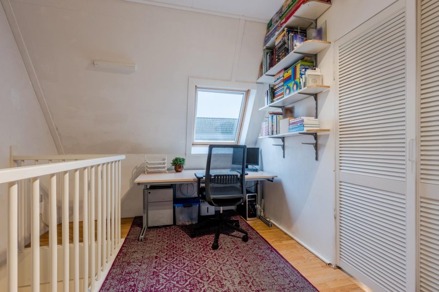 Via de open, met halve maantjes beklede trap, bereiken we de ruime overloop. Hier is slaapkamer nummer drie te vinden en een ruime werkplek/kantoor. Via de slaapkamer kom je in een berging met de aansluiting voor het witgoed en de technische installatie. Het daglicht komt hier via Velux dakramen binnen.