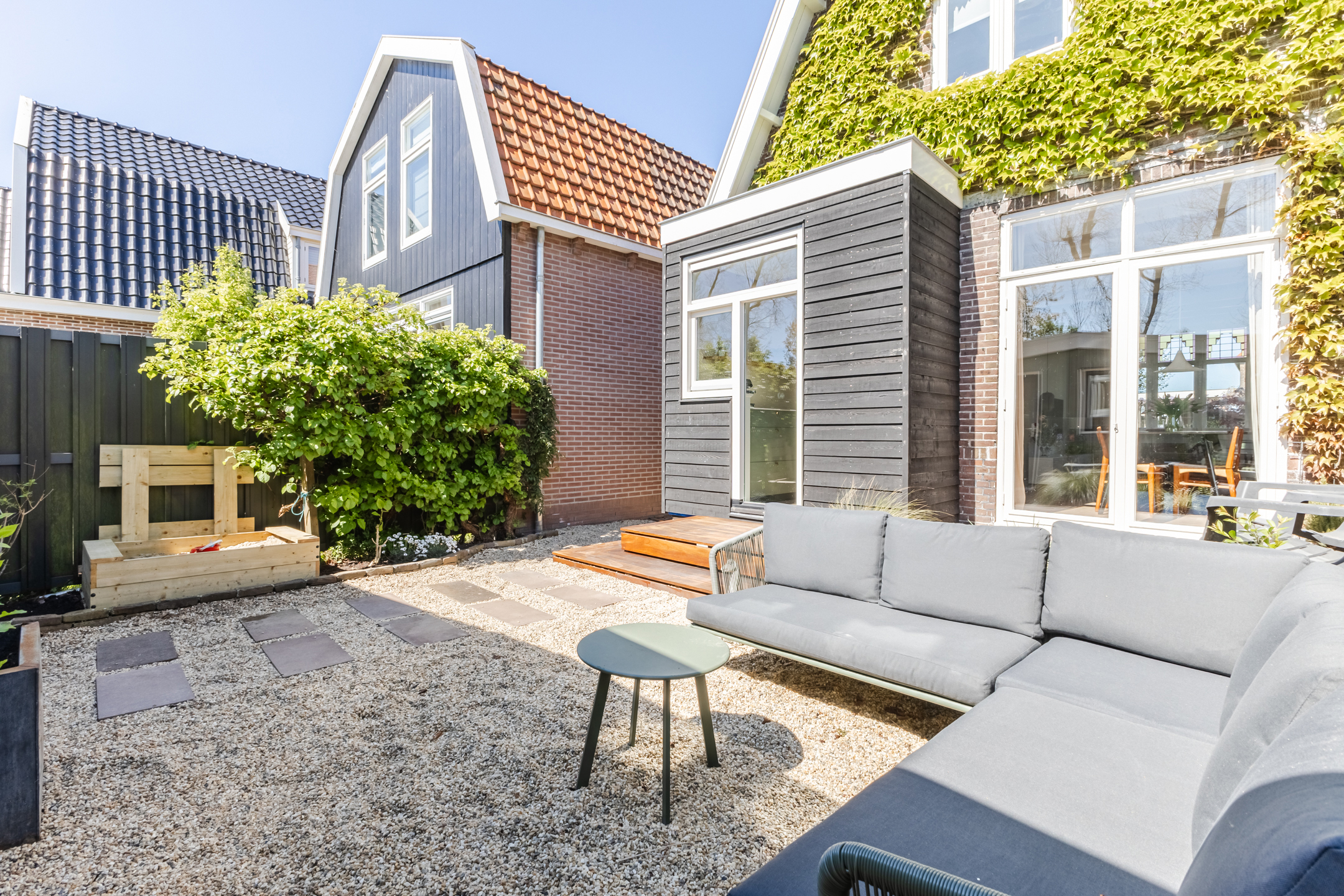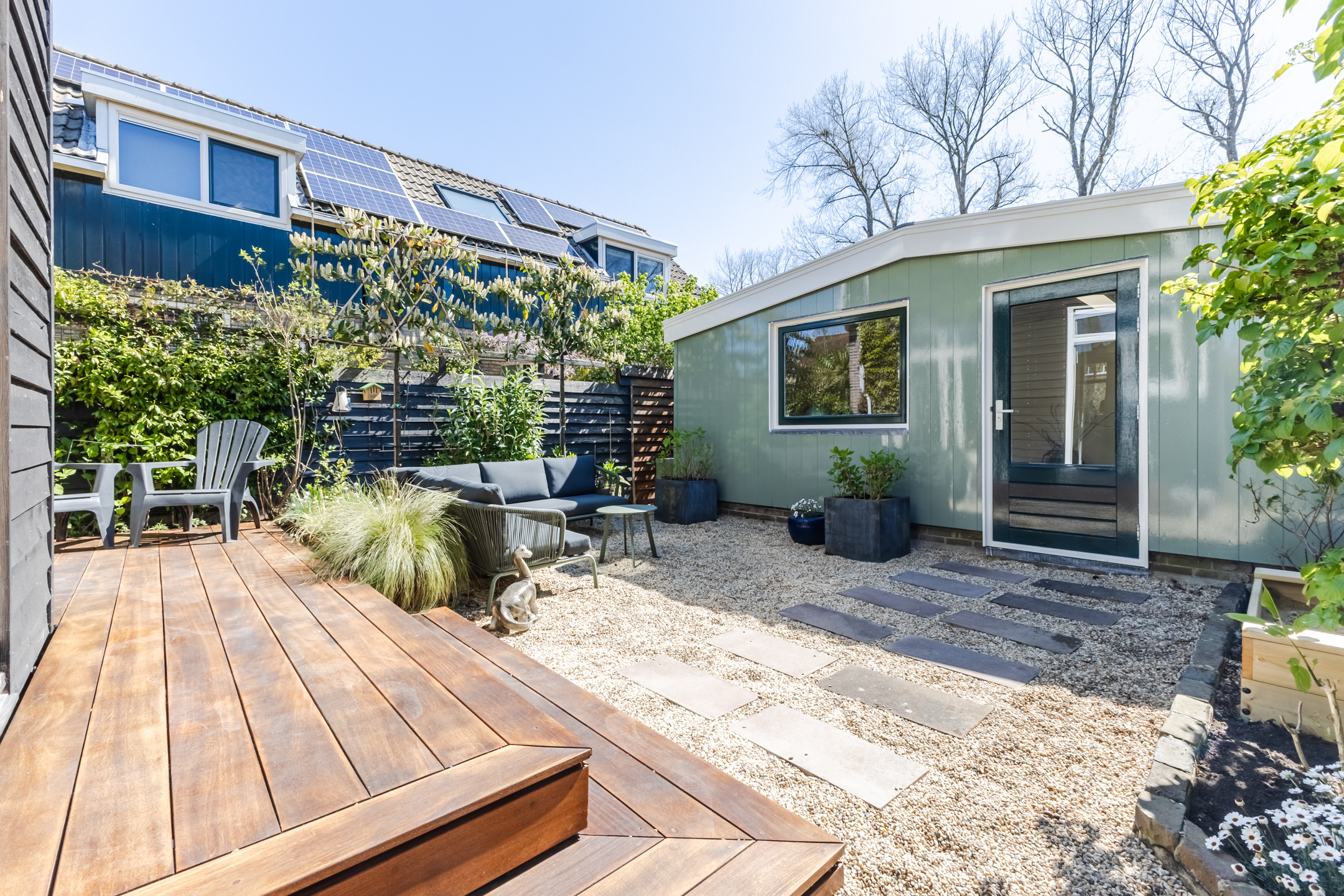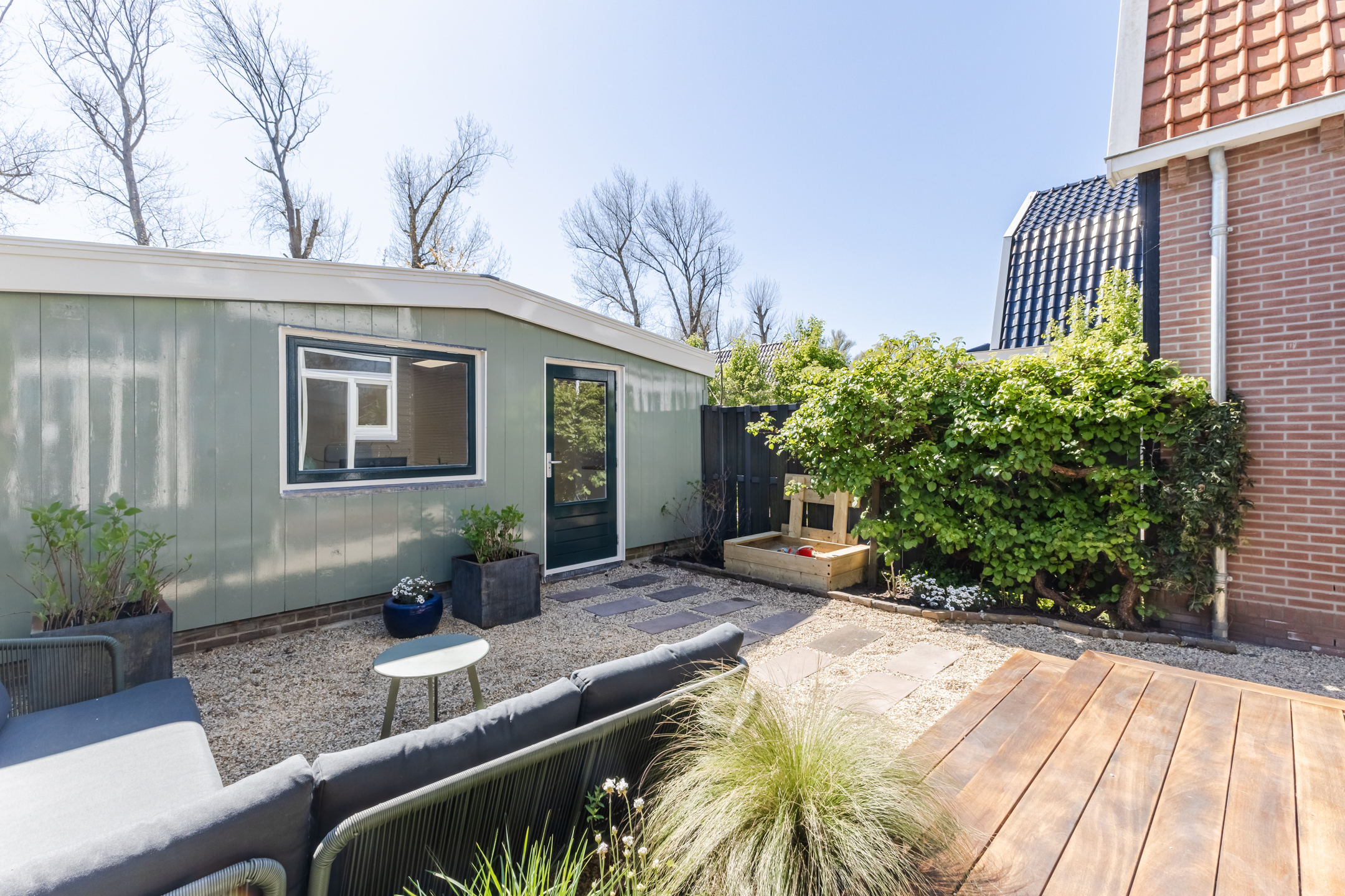 What a wonderful garden! This backyard is modern and attractively landscaped with a combination of wooden decking, gravel and greenery. Directly adjacent to the house is a wooden deck with space for a cozy seating area. The rest of the garden also offers plenty of room for a seating area or dining spot. Thanks to its south-facing location, you’re guaranteed plenty of sunshine. You can enjoy the sun here in complete peace, as the garden is well-sheltered.