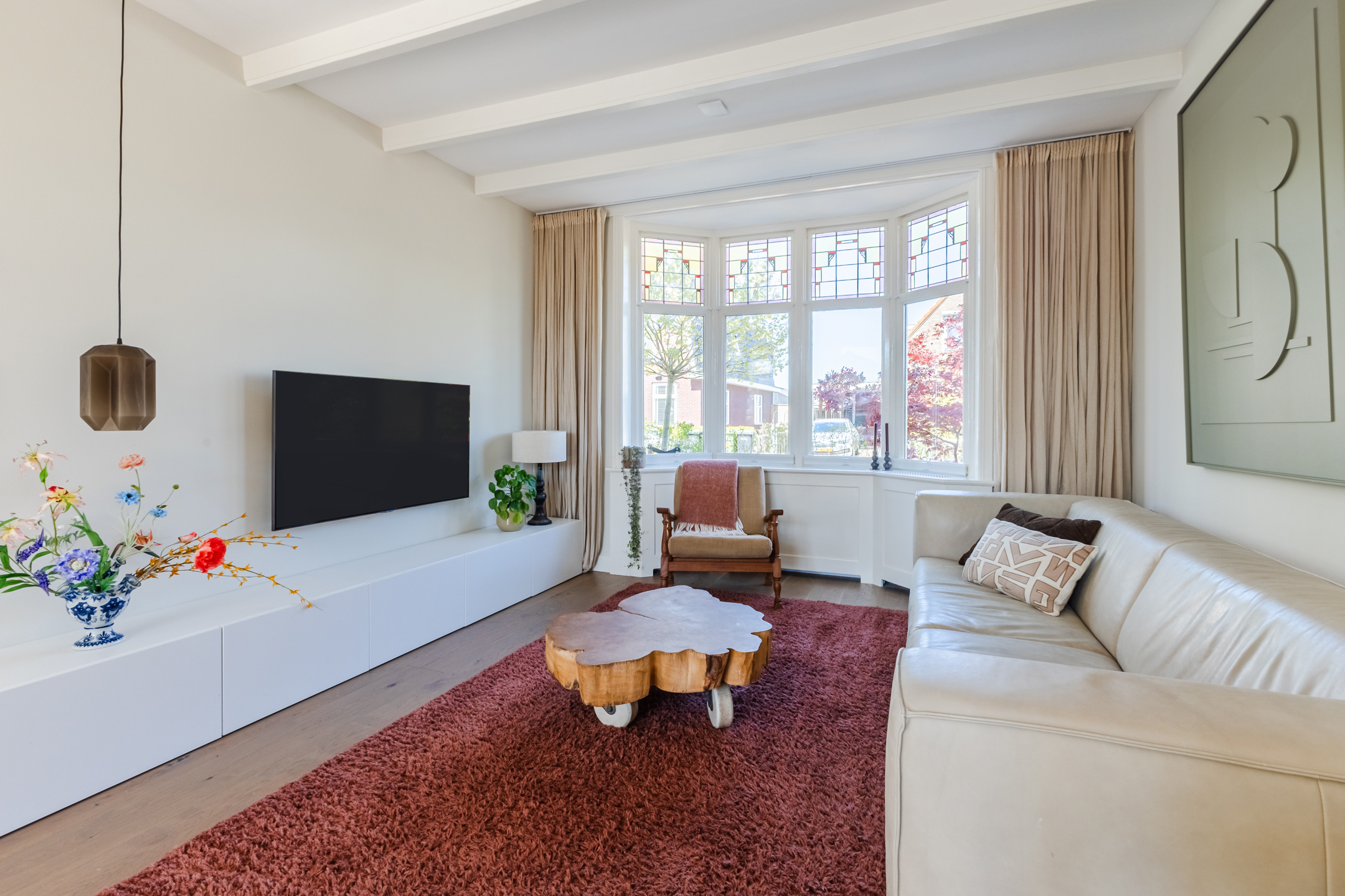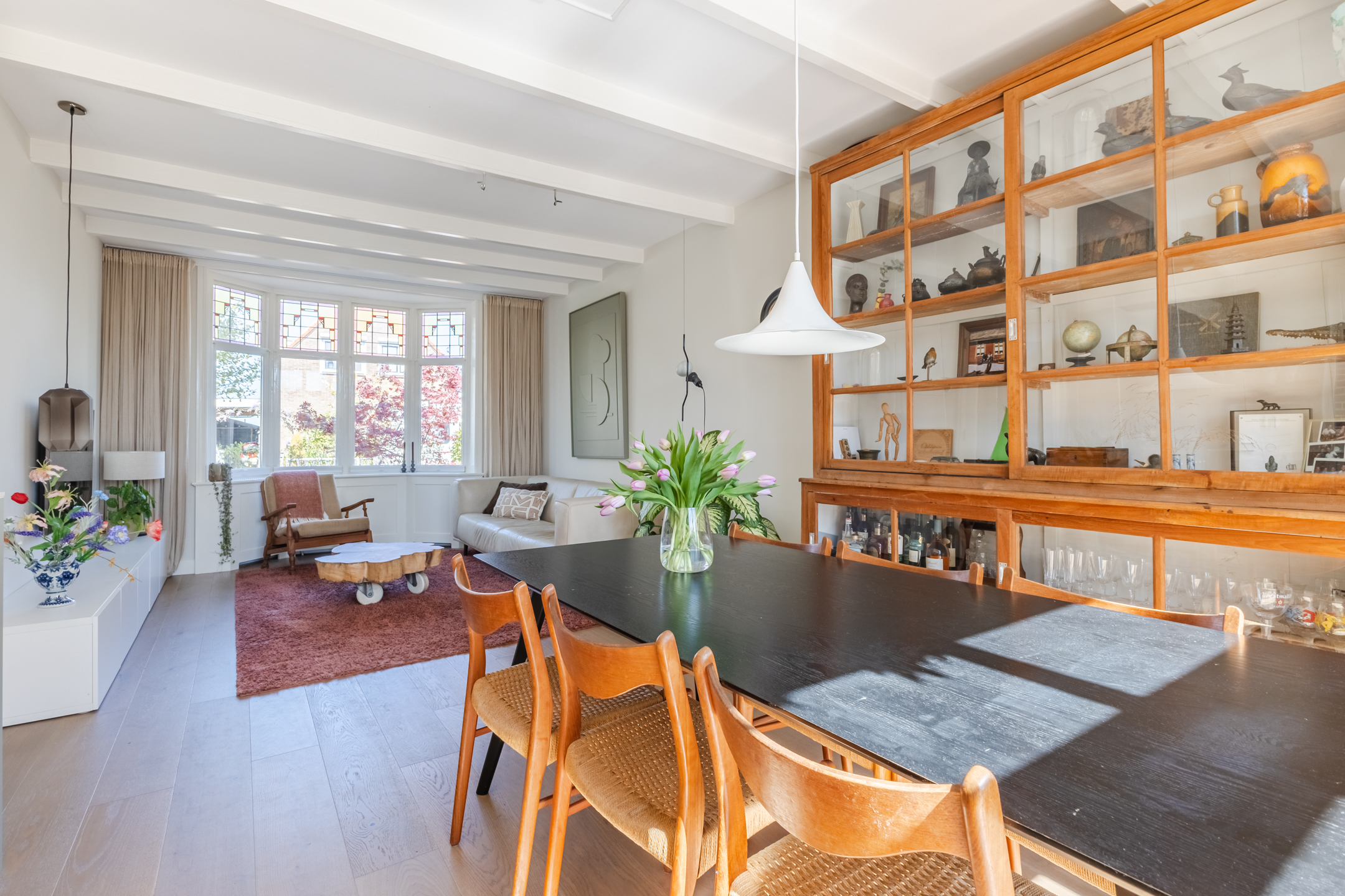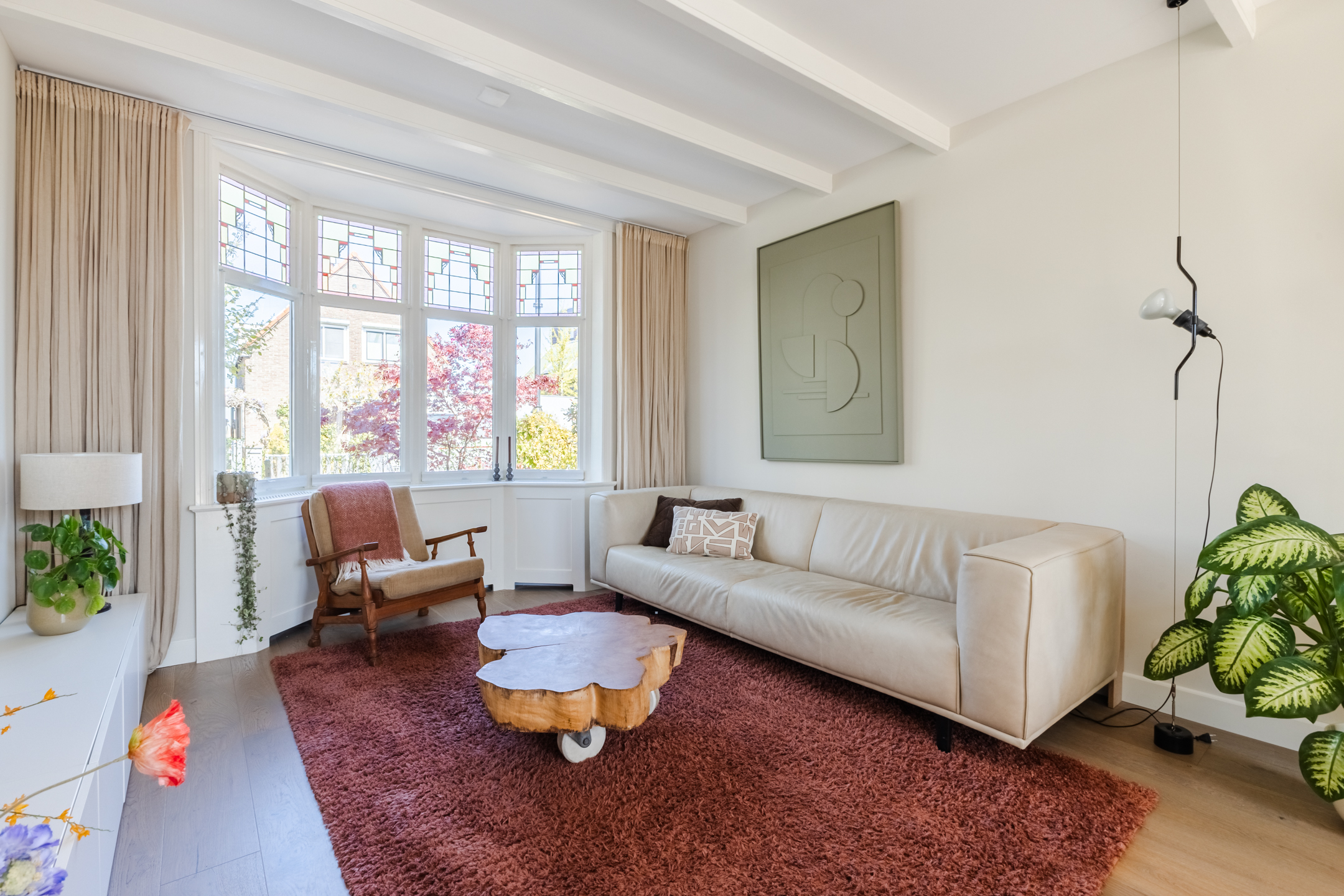 The living room, which spans the width of the house, features beautiful flooring and neatly finished walls. Several authentic details have been preserved, including a bay window at the front, a beamed ceiling and stained-glass windows. Thanks to the bay window and the garden doors, the living room is flooded with natural light.