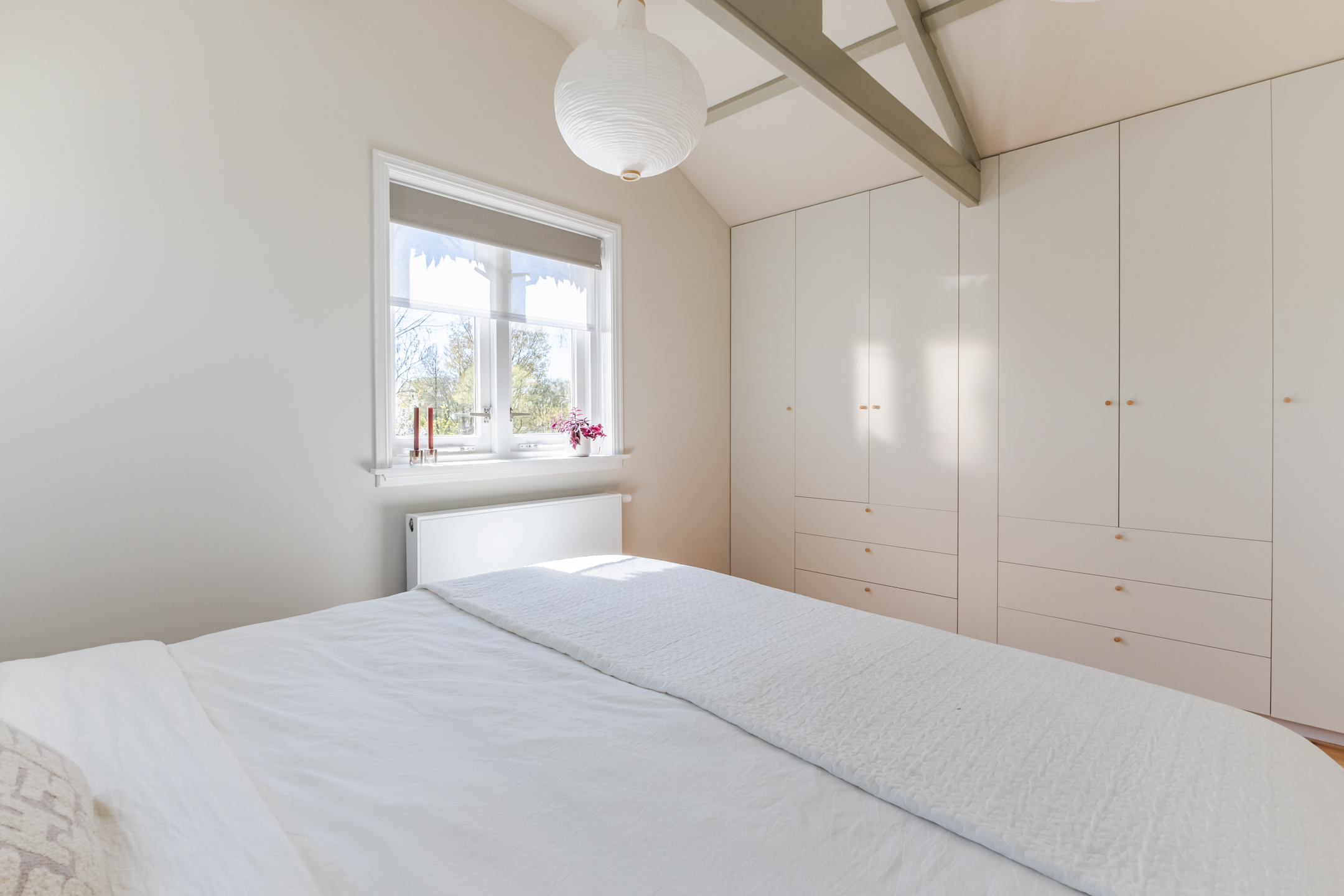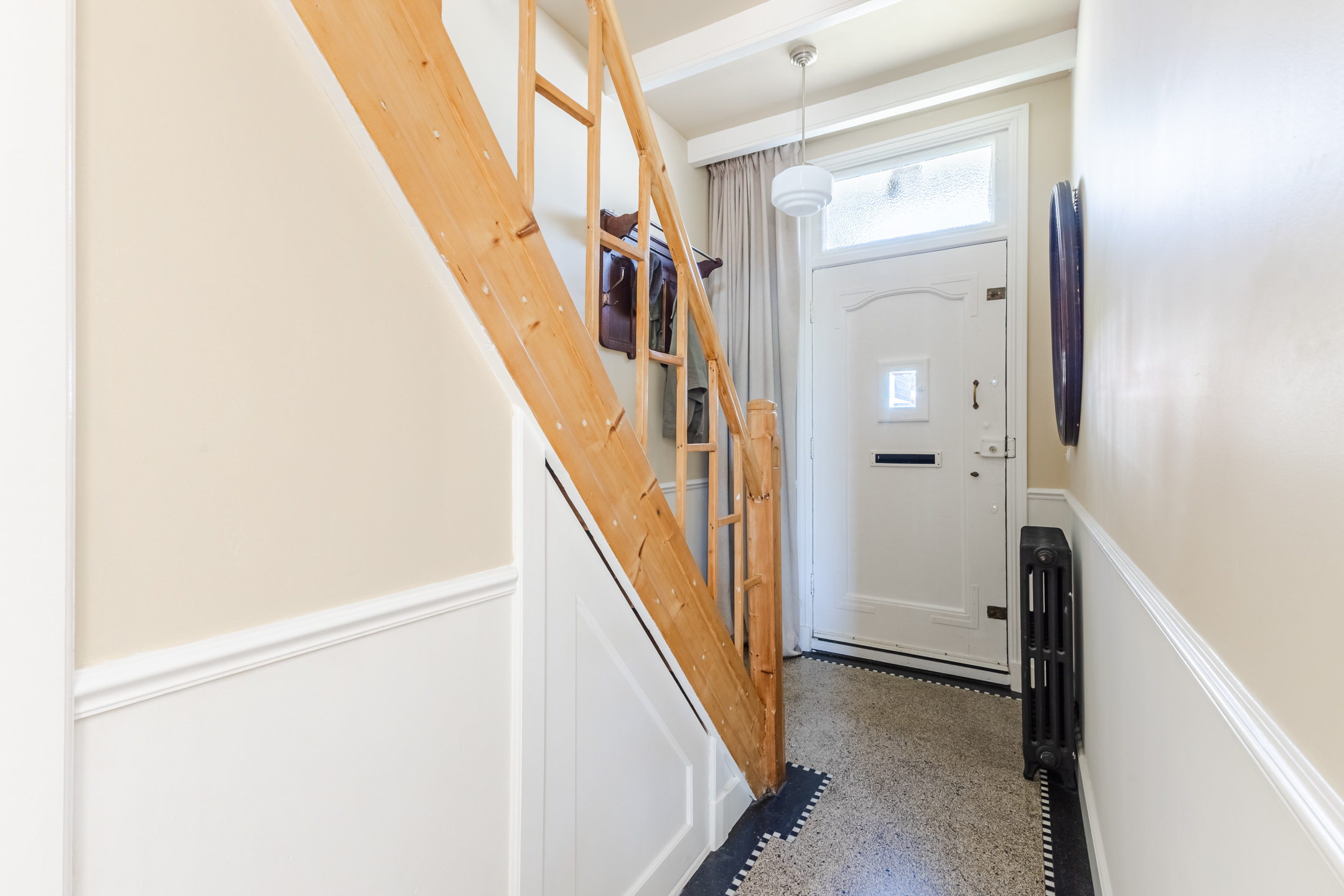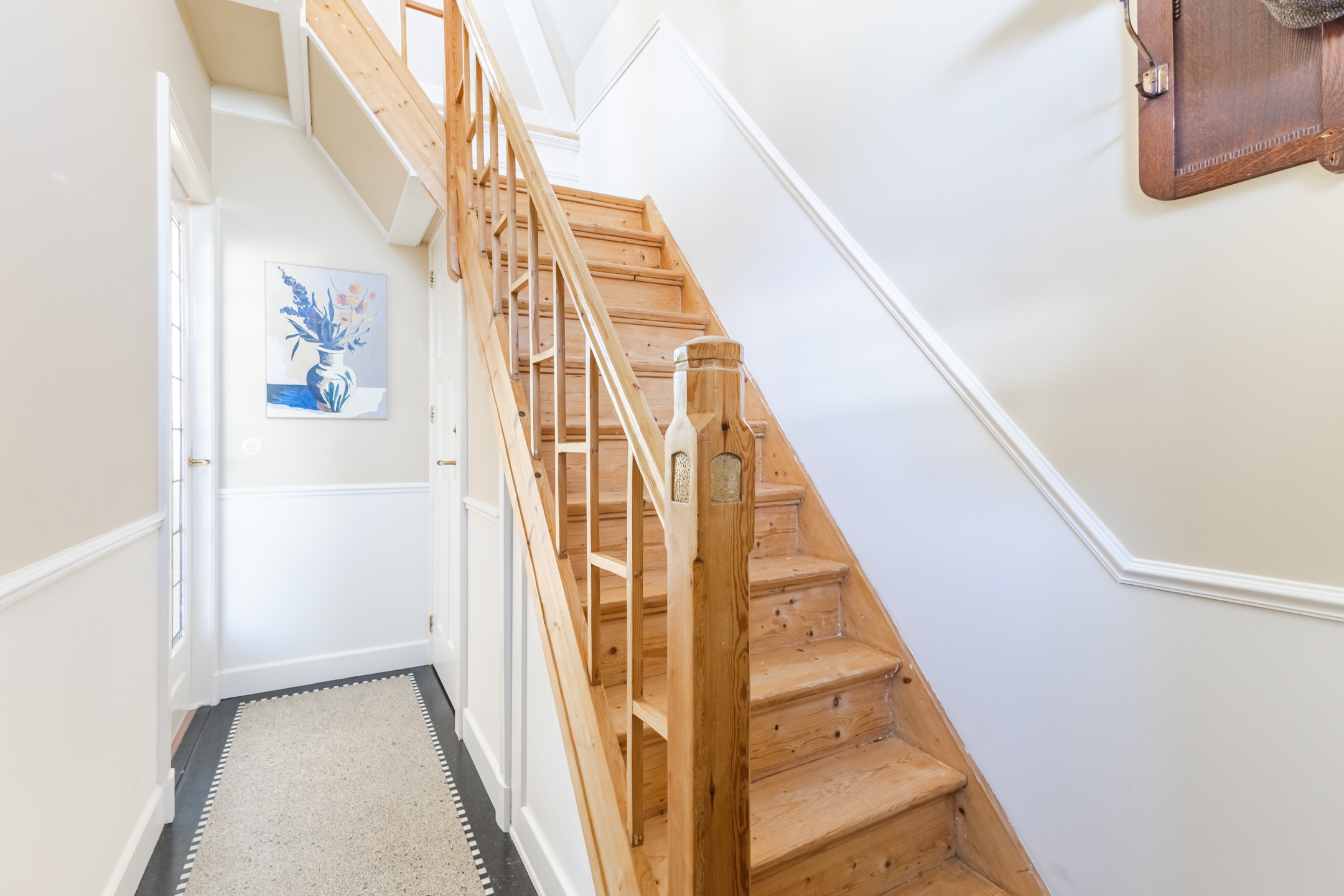 The living room, which spans the width of the house, features beautiful flooring and neatly finished walls. Several authentic details have been preserved, including a bay window at the front, a beamed ceiling and stained-glass windows. Thanks to the bay window and the garden doors, the living room is flooded with natural light.