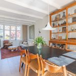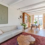 In de doorzonwoonkamer zijn de wanden netjes afgewerkt. Enkele authentieke details zijn bewaard gebleven, waaronder een erker aan de voorzijde, een balkenplafond en glas-in-lood ramen. Dankzij het erkerraam en de openslaande deuren wordt de woonkamer overspoeld met natuurlijk licht.