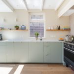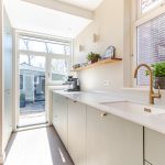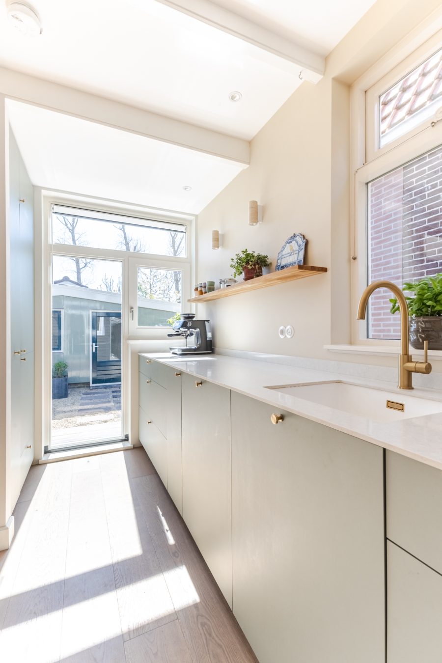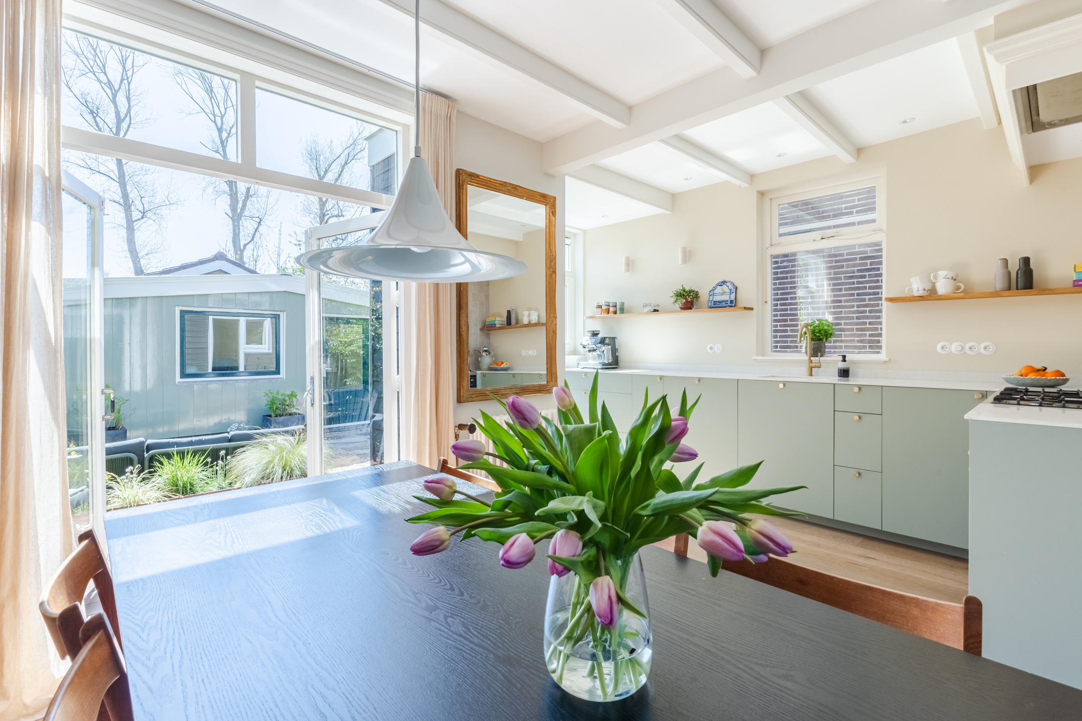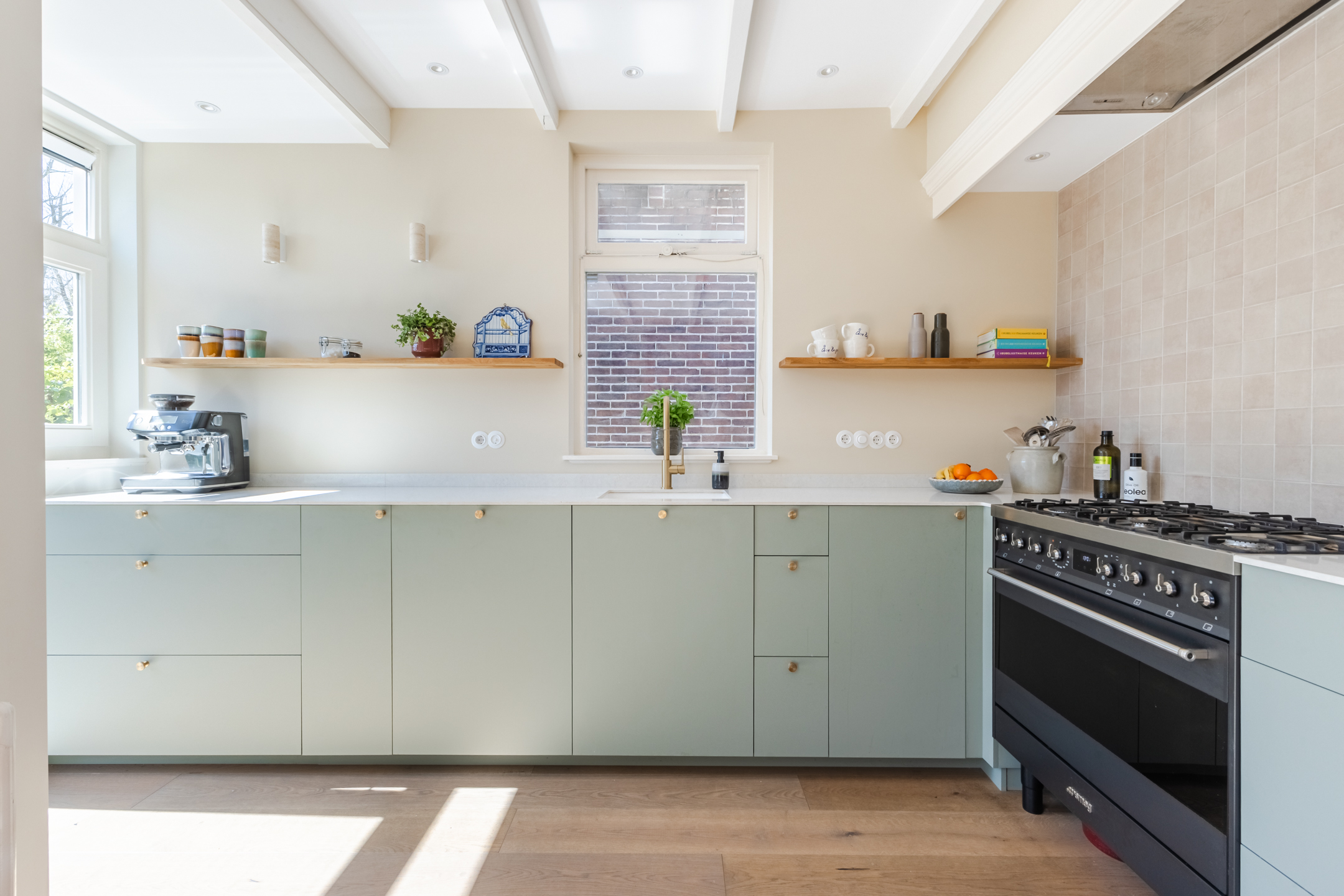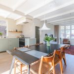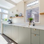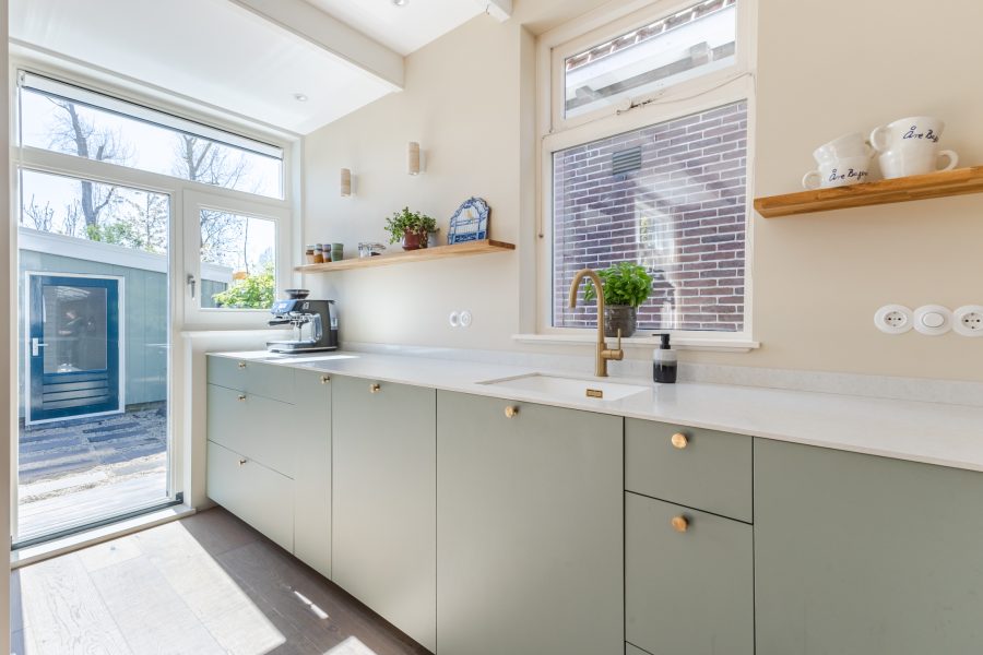 De halfopen keuken is in 2024 vernieuwd en uitgevoerd in een praktische hoekopstelling. Het heeft een modern design met groene kastjes en een wit composiet werkblad. Er is hoogwaardige apparatuur aanwezig, waaronder een vaatwasser, gasfornuis, afzuigkap, oven, koelkast en vriezer. Je geniet van veel daglicht tijdens het koken. Verder wordt de keuken verlicht door inbouwspots.