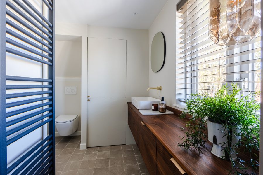 The bathroom was renovated in 2024 and exudes luxury. Here you will find a floating toilet, a vanity unit with a sink and a walk-in shower with a rain showerhead.