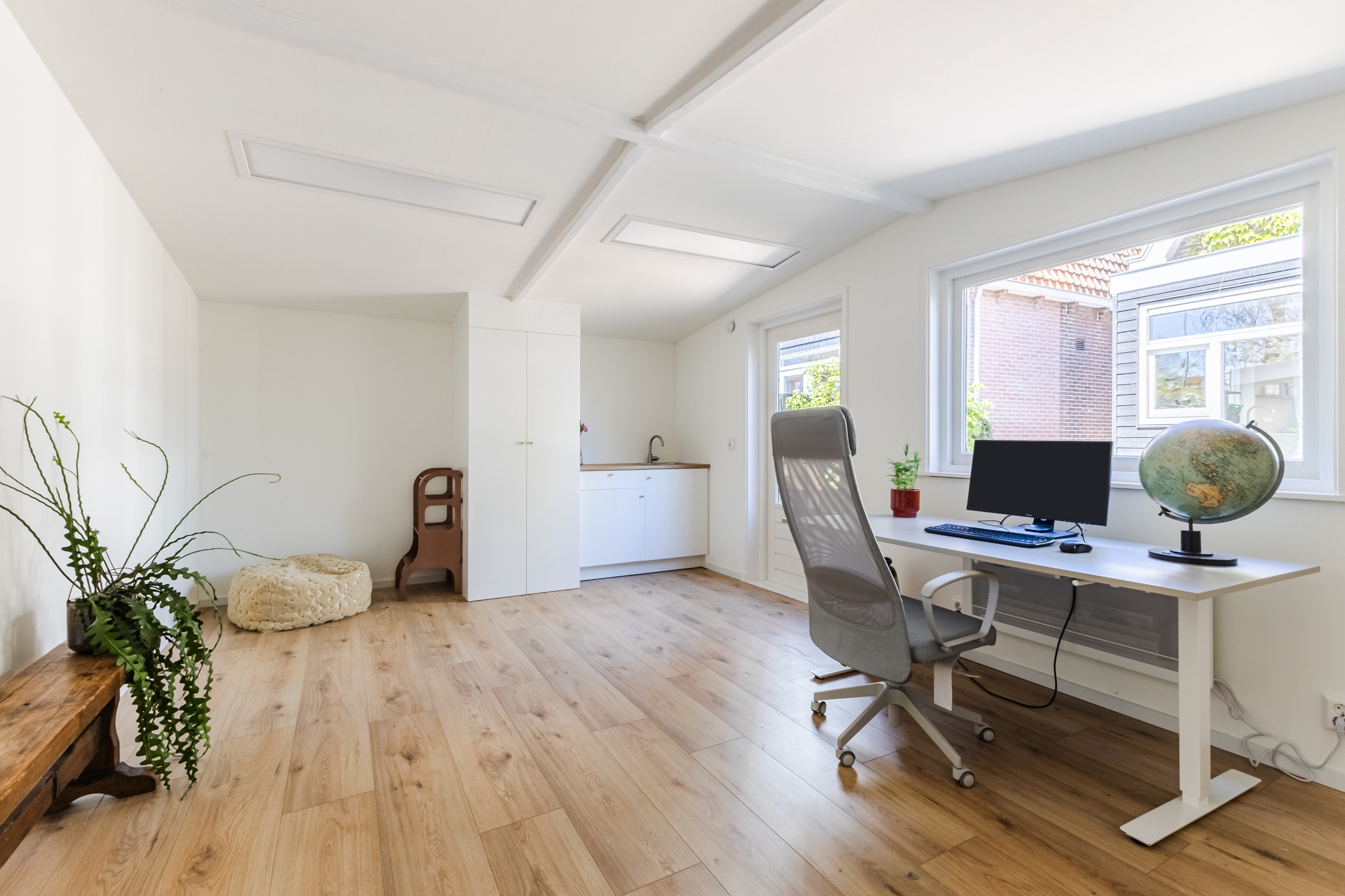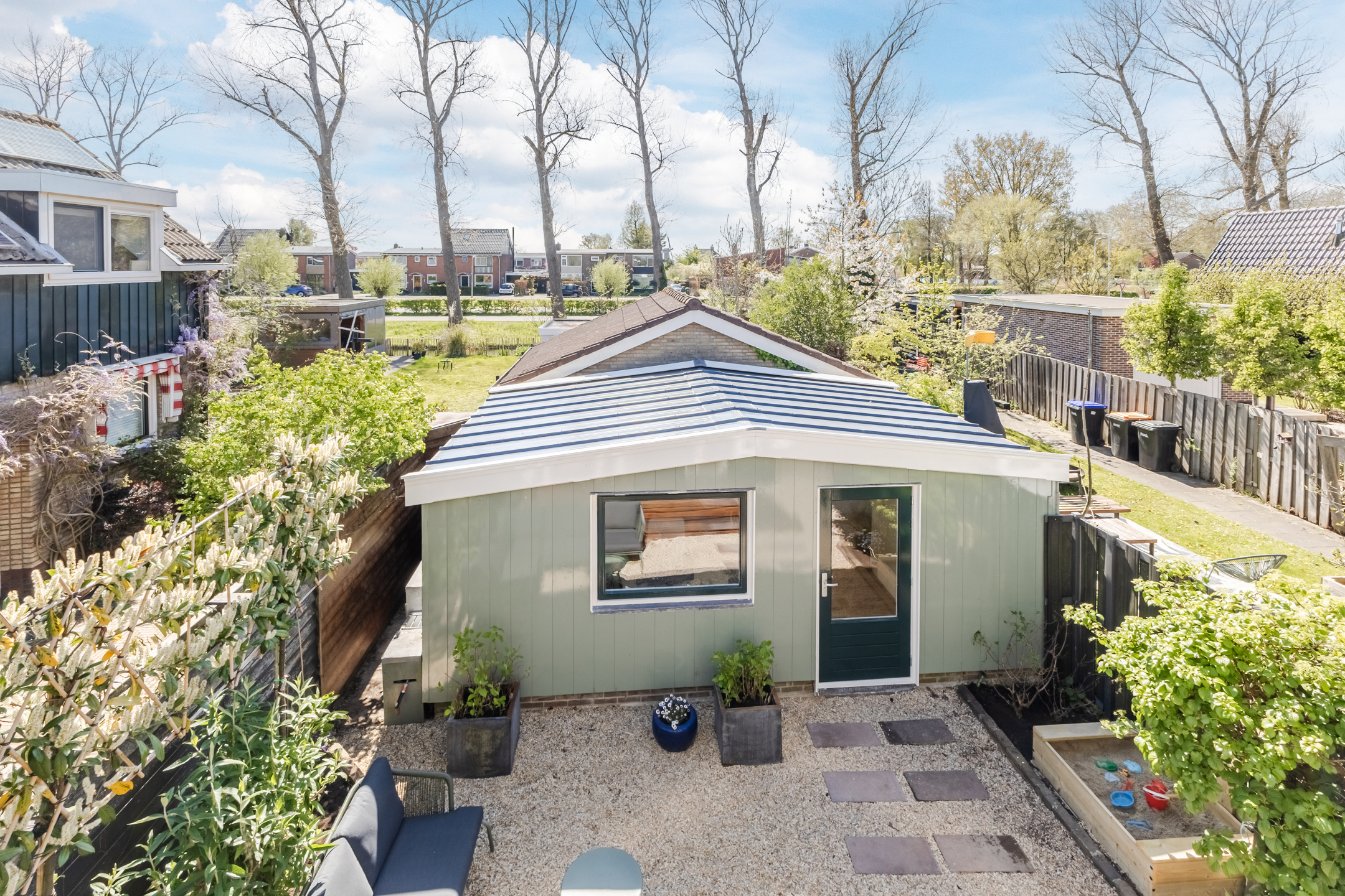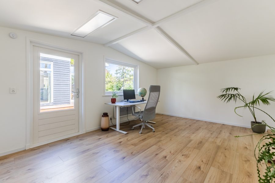 Achterin de tuin bevindt zich een ruim bijgebouw. Deze fraai afgewerkte ruimte is multifunctioneel en uitstekend te gebruiken als logeerplek of kantoor.