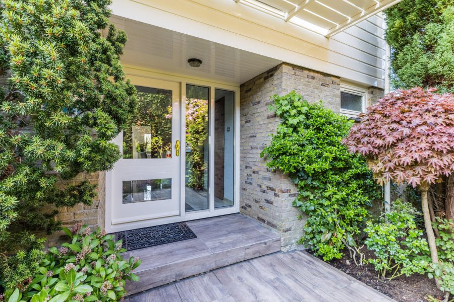 Terug in de keuken vind je er een deur naar de living en een deur naar de tuin. Op de vloer van de hal en de keuken liggen marmeren tegels.