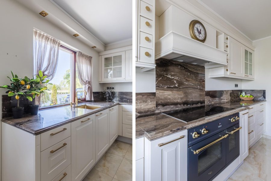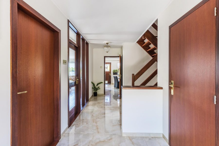 Back in the kitchen, you will find a door to the living room and a door to the garden. There are marble tiles on the hallway and kitchen floor.