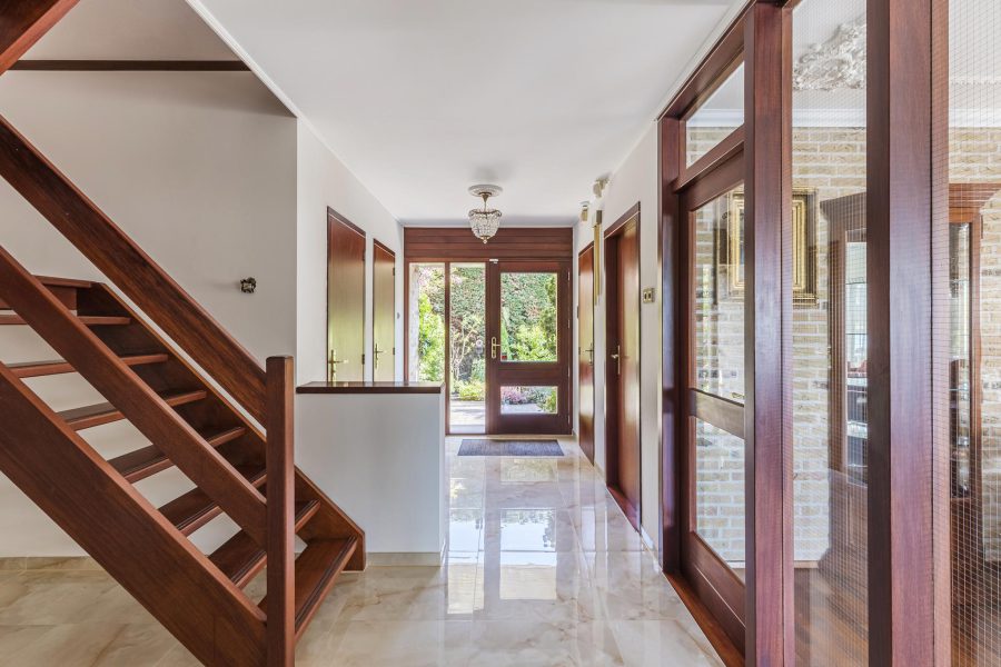 We zetten de auto op eigen terrein en bereiken via het pad aan de voorzijde de overkapte voordeur van de woning. Ruime entree met direct aan je linkerhand de slaapkamer en aan je rechterhand de badkamer met wastafel, spiegel en doucheruimte. Verderop in de gang bevindt zich het zwevende toilet met fonteintje, het trappenhuis naar de eerste verdieping, de toegang tot de woonkamer en aan het eind van de gang is de toegang tot de gesloten keuken te vinden. De ruime keuken is heeft een L-vormig keukenblok met marmeren blad en is voorzien van hoogwaardige inbouwapparatuur, o.a een Quooker. Je kookt hier op inductie. De keuken is groot genoeg om een eettafel te plaatsen. Via de keuken is een tussenhal bereikbaar met toegang tot de zeer ruime multifunctionele loods. De loods heeft een eigen toegangsdeur naar buiten. Verder tref je er 2 pantry’s aan, een gastentoilet met fonteintje en trap naar een kantoor. De loods is keurig afgewerkt en onderhouden.