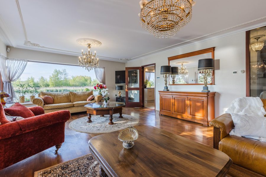 De lichte woonkamer heeft een viertal raampartijen en een schuifpui naar het terras en tuin. De sfeervolle woonkamer heeft een schouw met open haard en een prachtig vrij uitzicht over het water. In de woonkamer ligt een fraaie parketvloer en de muren en plafonds zijn strak en decoratief afgewerkt.