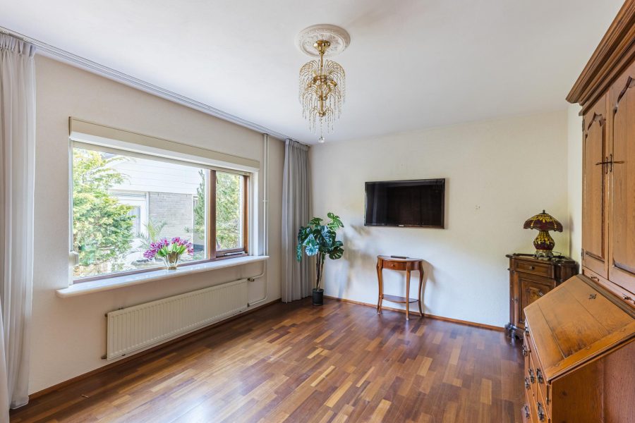 We put the car on private property and reach the covered front door of the house via the path at the front. Spacious entrance with directly on your left the bedroom and on your right the bathroom with sink, mirror and shower room. Further down the hallway you will find the floating toilet with hand basin, the staircase to the first floor, access to the living room and at the end of the hallway you will find access to the closed kitchen. The spacious kitchen has an L-shaped kitchen unit with marble top and is equipped with high-quality built-in appliances, including a Quooker. You cook electric here. The kitchen is large enough to accommodate a dining table. Through the kitchen, an intermediate hallway is accessible with access to the very spacious multifunctional shed. The shed has its own access door to the outside. There are two pantries, a guest toilet with hand basin and stairs to an office. The shed is nicely finished and maintained.