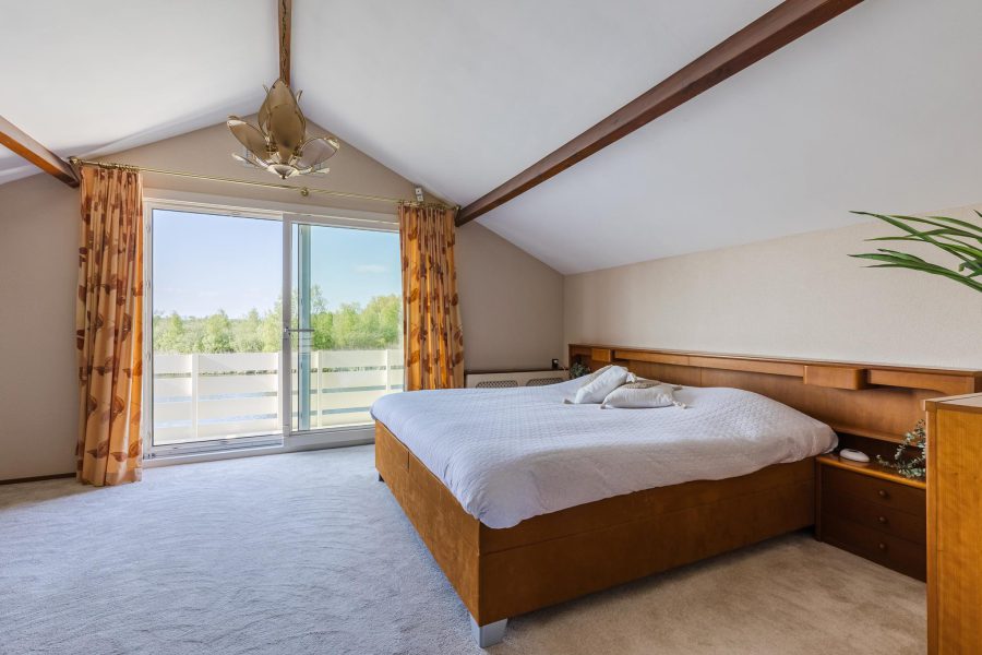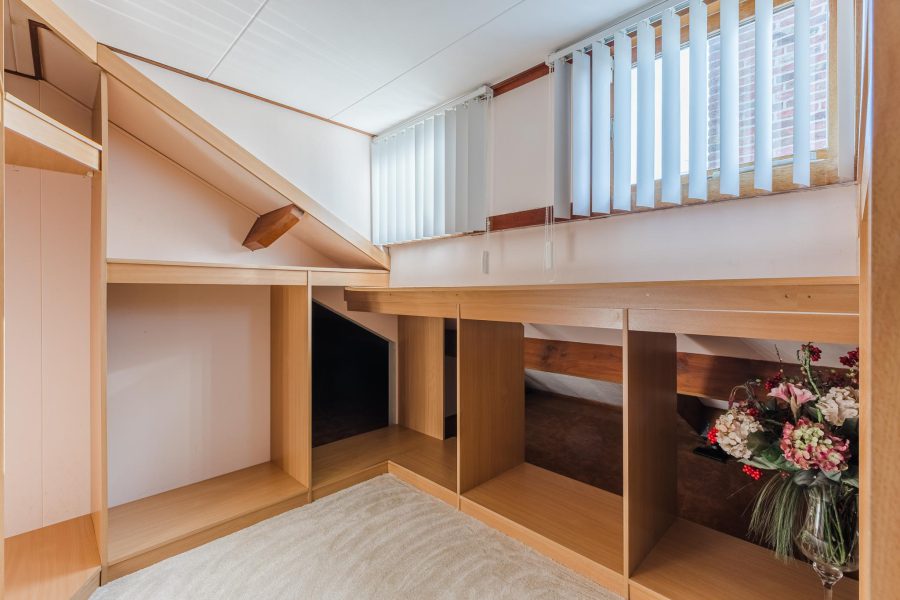 Via een fraai houten trappenhuis bereiken we de overloop van deze verdieping. Hier zijn twee slaapkamers te vinden. Een ruime slaapkamer ligt aan de achterzijde en is voorzien van een brede opbergkast. Deze slaapkamer heeft toegang tot een balkon met vrij uitzicht over het water. Wat is het hier heerlijk wakker worden. De walk in closet ligt centraal op de verdieping en de tweede slaapkamer, met toegang tot een eigen badkamer, ligt aan de voorzijde van de woning en heeft eveneens toegang tot een balkon. De fraaie, eigentijdse badkamer (2020) staat in open verbinding met de slaapkamer en is voorzien van een badmeubel met wastafel en spiegel, een zwevend toilet en een ruime inloopdouche met hand- en regendouche. Op deze verdieping tref je ook bergruimte aan en een afgesloten bergkast met de cv-installatie. Ook deze verdieping is hoogwaardig en keurig afgewerkt.