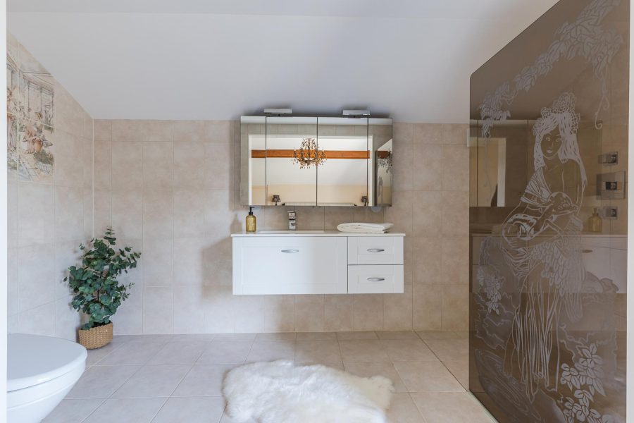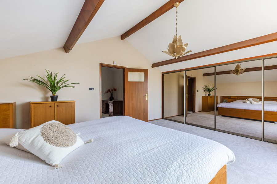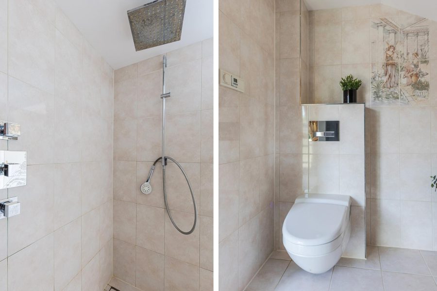 Through a beautiful wooden staircase we reach the landing of this floor. Two bedrooms can be found here. A spacious bedroom is located at the rear and features a wide storage closet. This bedroom has access to a balcony. The smaller bedroom is located centrally on the floor and the second bedroom, with access to a private bathroom, is located at the front of the house and also has access to a balcony with unobstructed views over the water. The beautiful, contemporary bathroom (2020) is open to the bedroom and has a vanity unit with sink and mirror, a floating toilet and a spacious walk-in shower with handheld and rain shower. On this floor you will also find storage space and an enclosed storage closet with the central heating system, This floor is also of high quality and nicely finished.