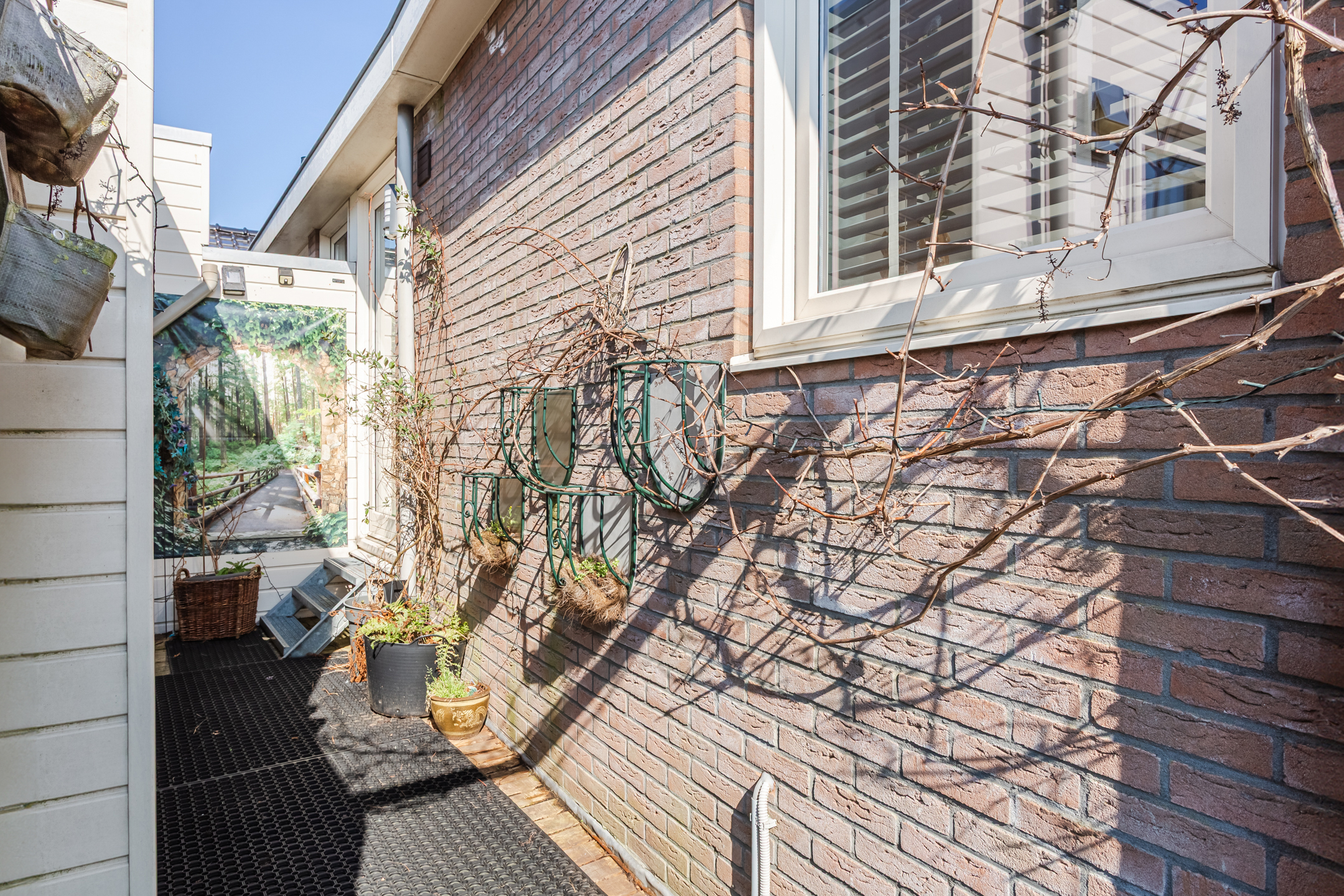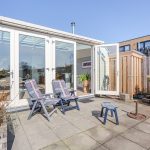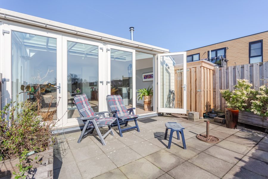 Openslaande deuren geven toegang tot het royale terras. Het terras is netjes betegeld en biedt genoeg ruimte voor een gezellig zitje. Dit is een heerlijke plek om van het zonnetje te genieten. Dat doe je in alle rust, want door de houten schuttingen ervaar je veel privacy.