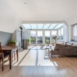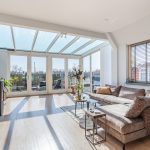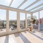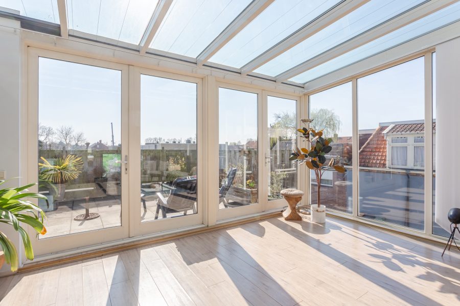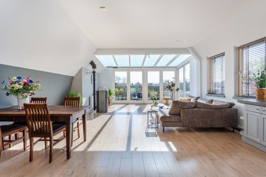 • Royale woonkamer met glazen dak, openslaande deuren en pelletkachel
