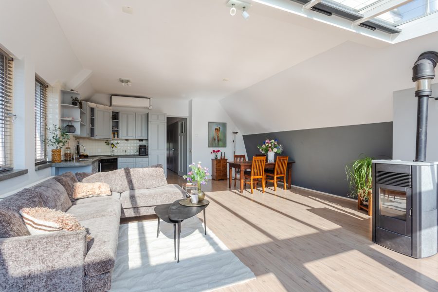 Achter de voordeur van het appartement bevindt zich een ruime entreehal die toegang biedt tot alle vertrekken. De royale woonkamer is sfeervol ingericht en afgewerkt met een mooie vloer en strakke wanden. De echte blikvanger is het glazen dak met geïntegreerde zonwering, die samen met de grote ramen voor een overvloed aan natuurlijk licht zorgt. In de woonkamer staat een pelletkachel voor extra warmte en sfeer. Daarnaast is er airconditioning aanwezig.