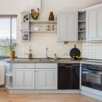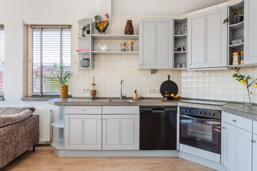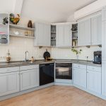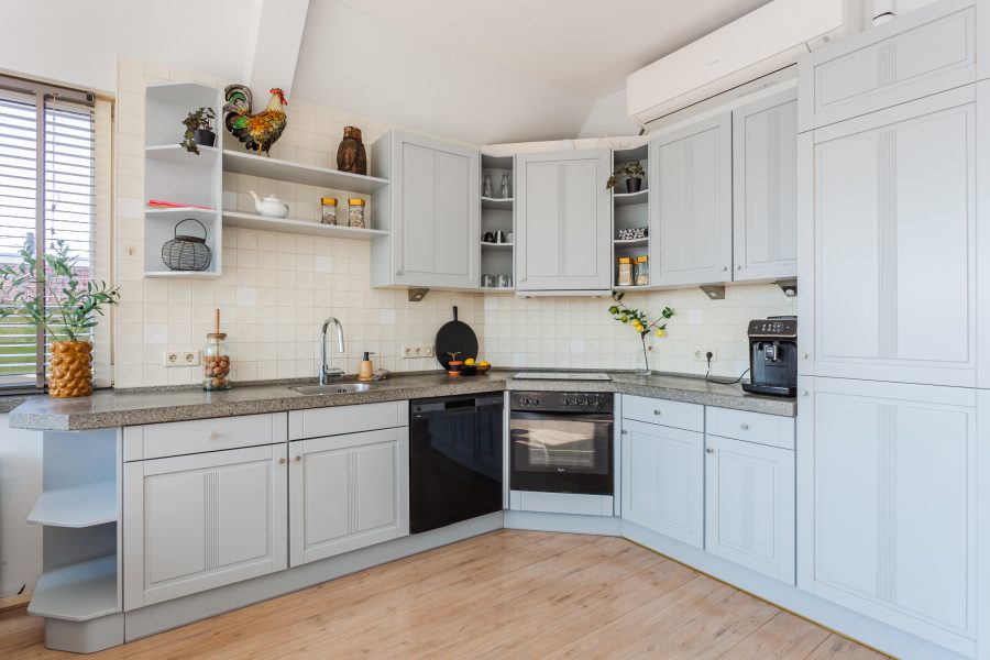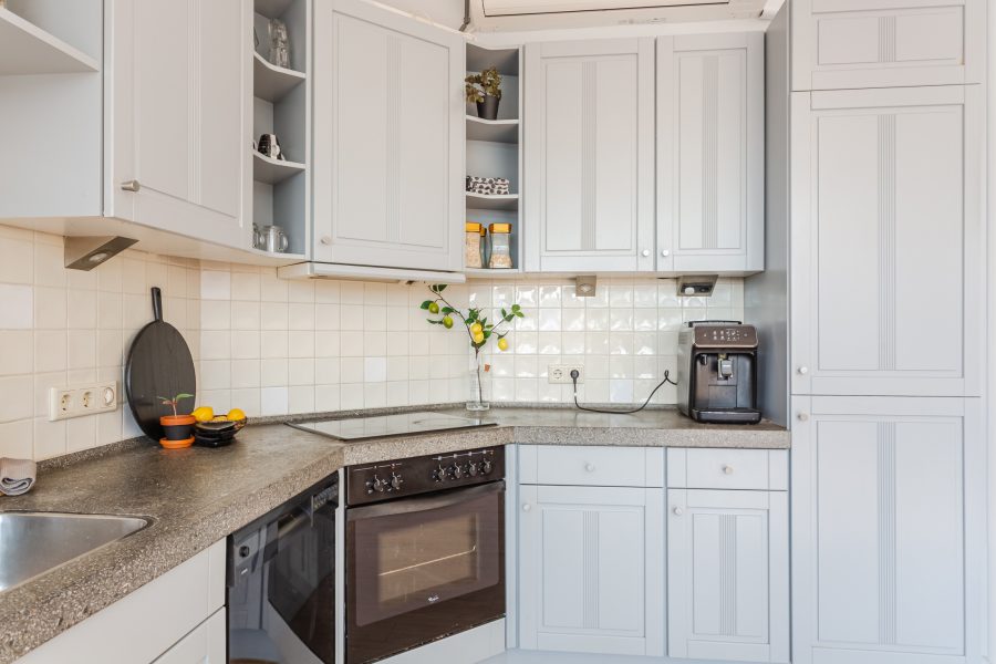The open kitchen (2012) is spacious and has a corner layout. The whole has a beautiful design with light gray kitchen cabinets and a granite-look worktop. The kitchen is equipped with the following appliances: dishwasher, induction stove, extractor hood, oven, refrigerator (2024) and freezer.
