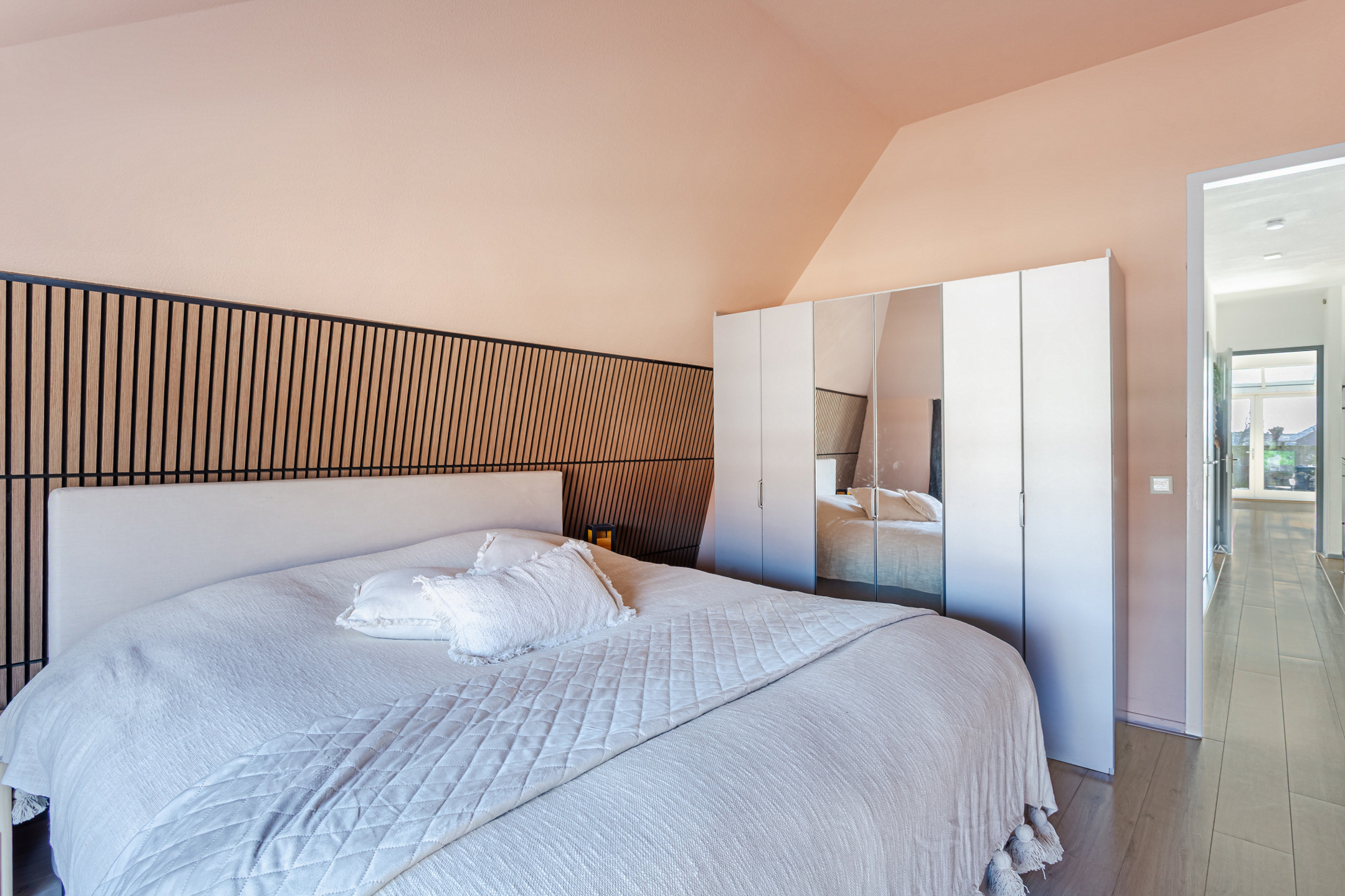 Behind the front door of the apartment is a spacious entrance hall that provides access to all rooms. The living room is attractively decorated and finished with beautiful flooring and sleek walls. The real eye-catcher is the glass roof with integrated sun blinds, which, together with the large windows, provides an abundance of natural light. In the living room there is a pellet stove for extra warmth and ambiance. In addition, air conditioning is present.