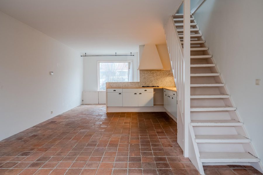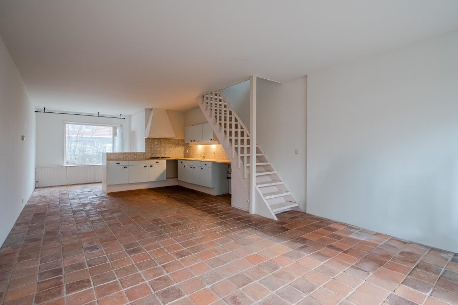 Through the front garden you reach the covered front door of this fine terraced house. Behind the front door is the entrance hall with meter cupboard and access to the living room. The spacious, expanded living room has a tiled floor with underfloor heating. Through the large windows at the front and the sliding doors at the rear there is a lot of natural light inside.