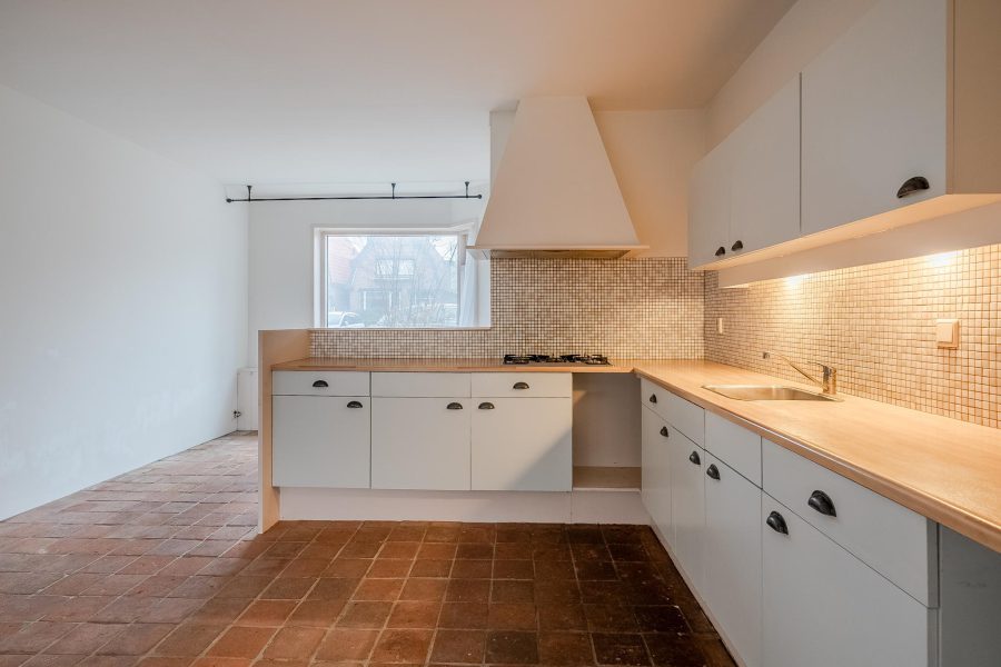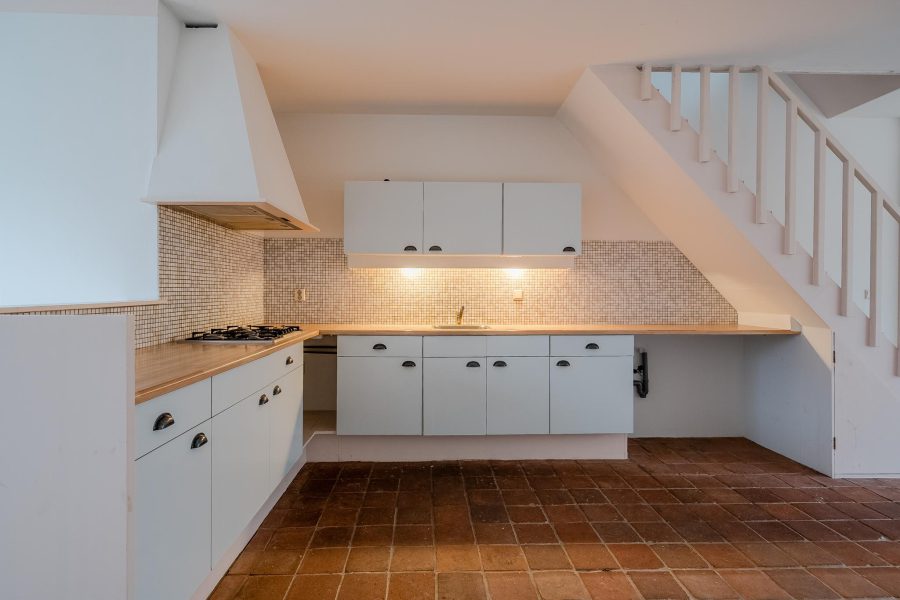 De open keuken dateert uit circa 2000 en staat in hoekopstelling. De keuken kenmerkt zich door de witte keukenkastjes en het houtkleurige werkblad. Je beschikt hier over een gasfornuis met afzuigkap In de woonkamer