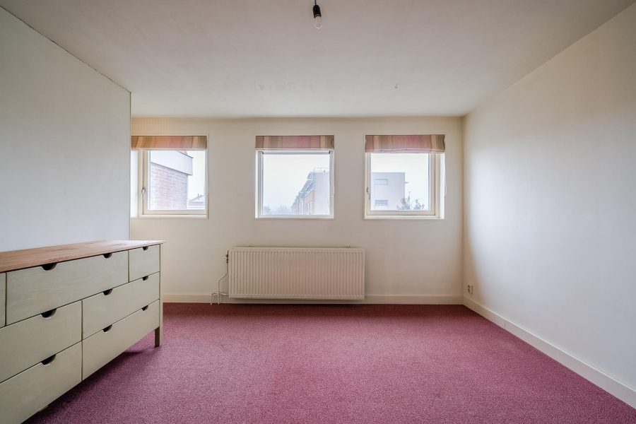 De zeer ruime slaapkamer op deze verdieping is uitgerust met een rode tapijtvloer. De wanden en het plafond zijn hier netjes afgewerkt in een rustige kleur. Dankzij de drie grote ramen profiteer je van veel daglicht. De slaapkamer