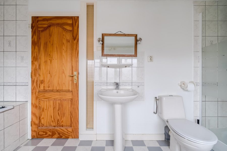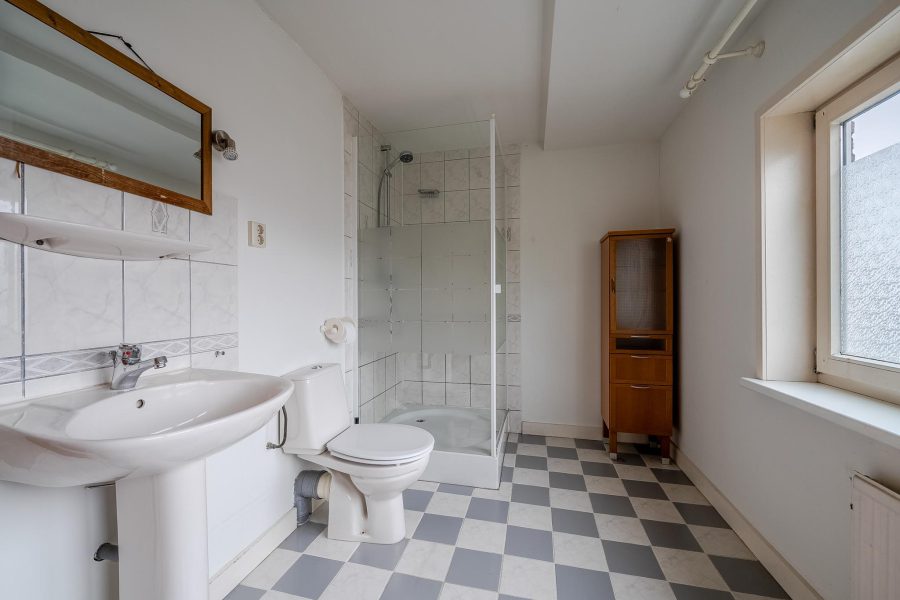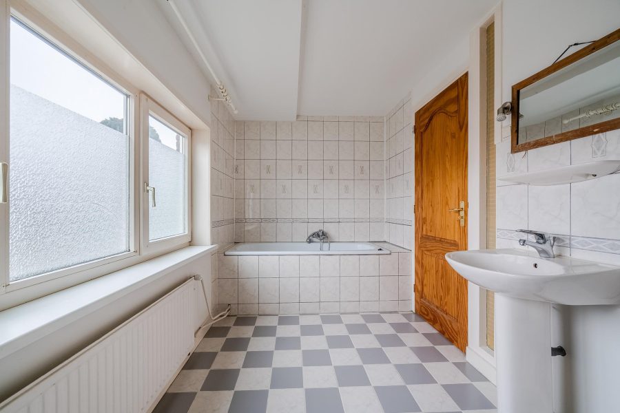 De badkamer ligt over de gehele breedte van het huis en is daardoor verrassend ruim. De ruimte is in lichte kleuren betegeld en uitgerust met een staand toilet, wastafel, ligbad en douchecabine.
