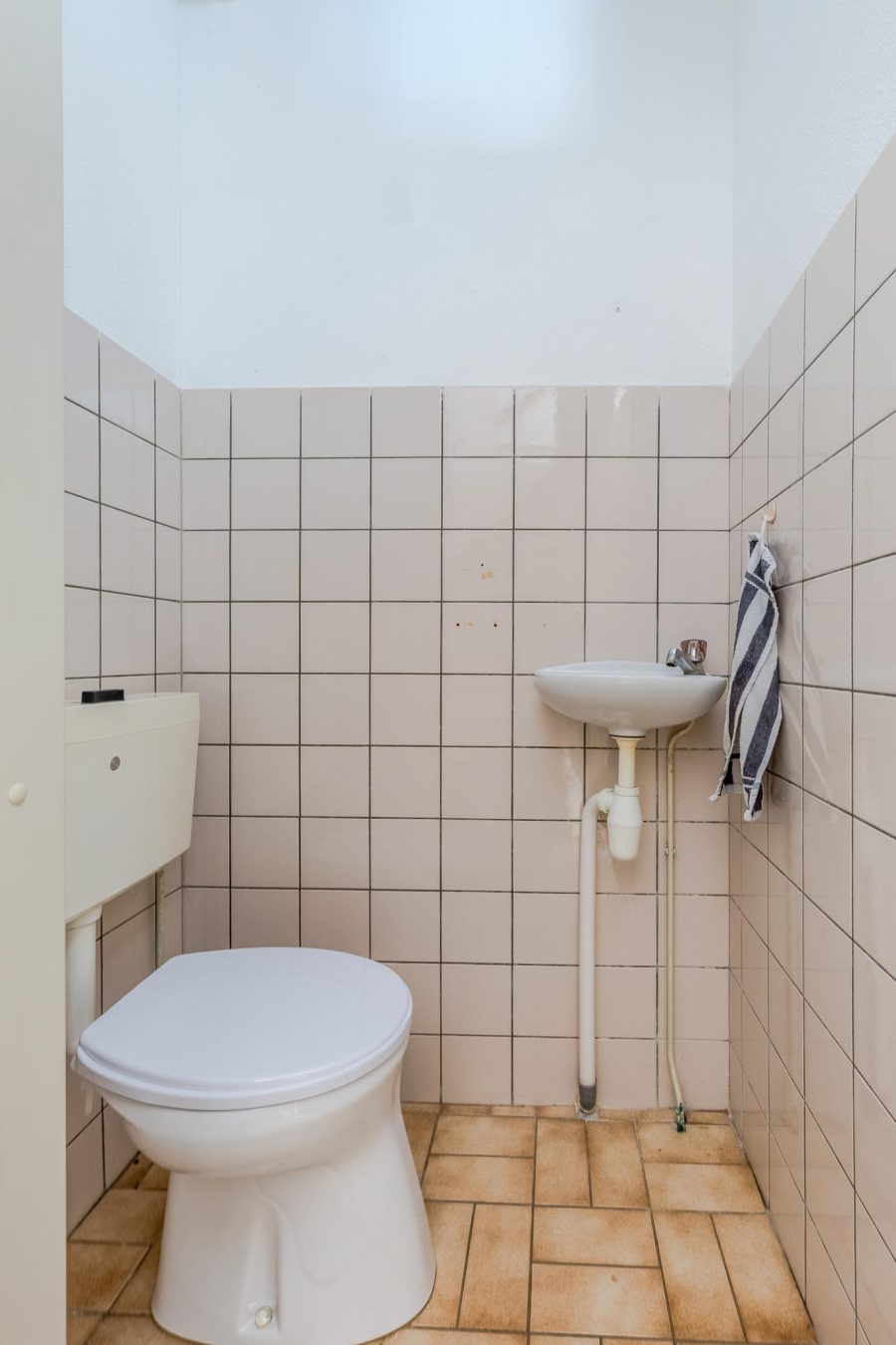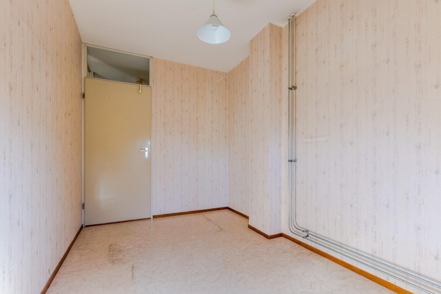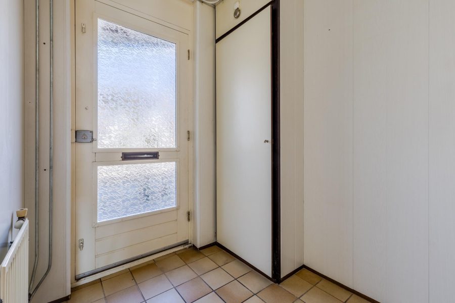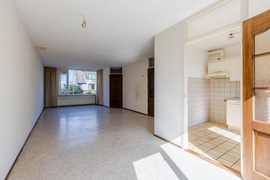 Through the wide pavement with plantation and the partly green, partly tiled front garden we reach the covered front door. Entrance with meter closet, wardrobe, storage closet and access to the living room. The deep living room has a bay window at the front and windows overlooking the garden at the back. At the rear, you will find access to the kitchen. The simple straight kitchen has white fronts and no appliances. The kitchen has an access door to the garden. At the back of the living room is a second door giving access to a small hallway with the toilet and hand basin and the staircase to the first floor. The living room floor has vinyl and the walls and ceilings are nicely finished.