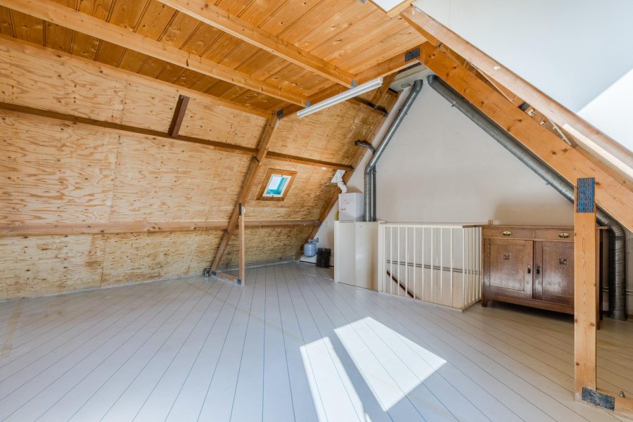 Via the fixed open staircase, you reach the attic floor. This room has a Velux skylight at the front and a dormer window at the back. This room has a mezzanine and is large enough to create a fourth bedroom/work/hobby room. The central heating system can also be found here.