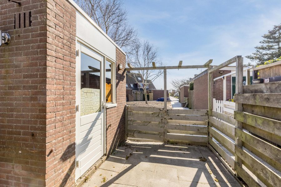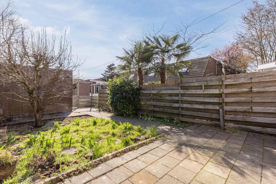 De woning heeft een voortuin en een diepe, deels groene, deels betegelde achtertuin met stenen (fietsen)berging. De achtertuin biedt veel privacy en is heerlijk zonnig. Aan de woning vast bevindt zich een terras waar je een fijne loungeplek kunt realiseren. Aan de achtermuur van de woning bevindt zich een zonnescherm, zodat er ook altijd een plekje in de schaduw te vinden is. Er is een achterom.