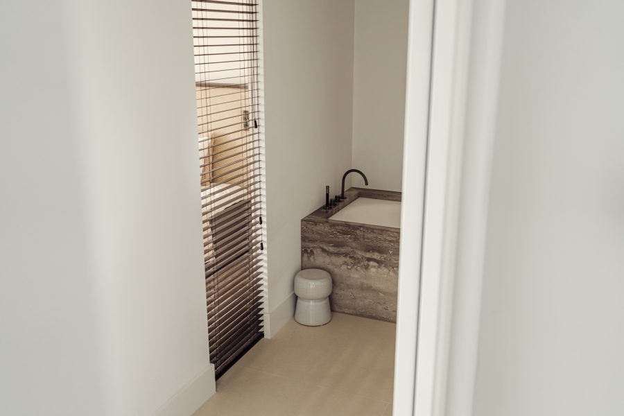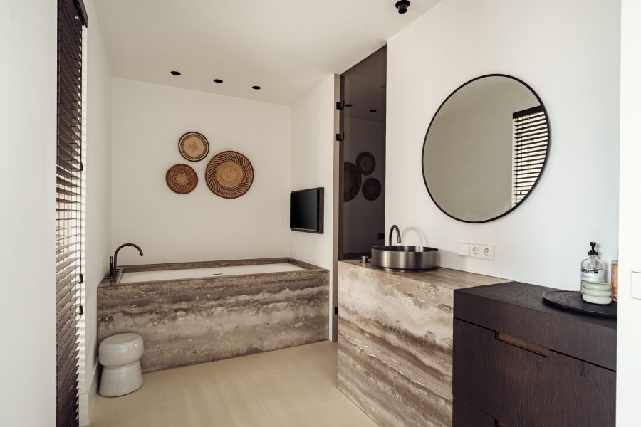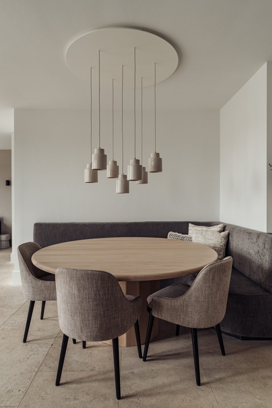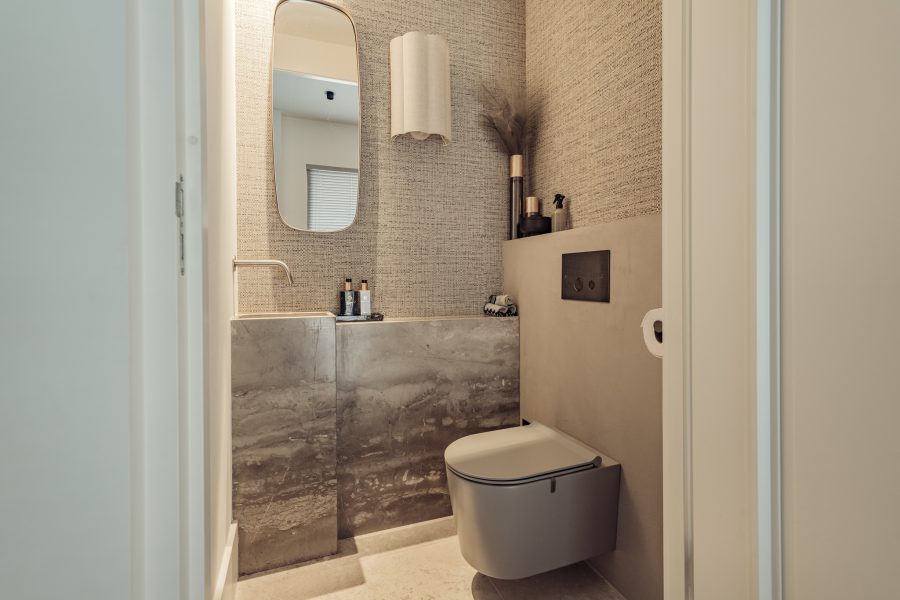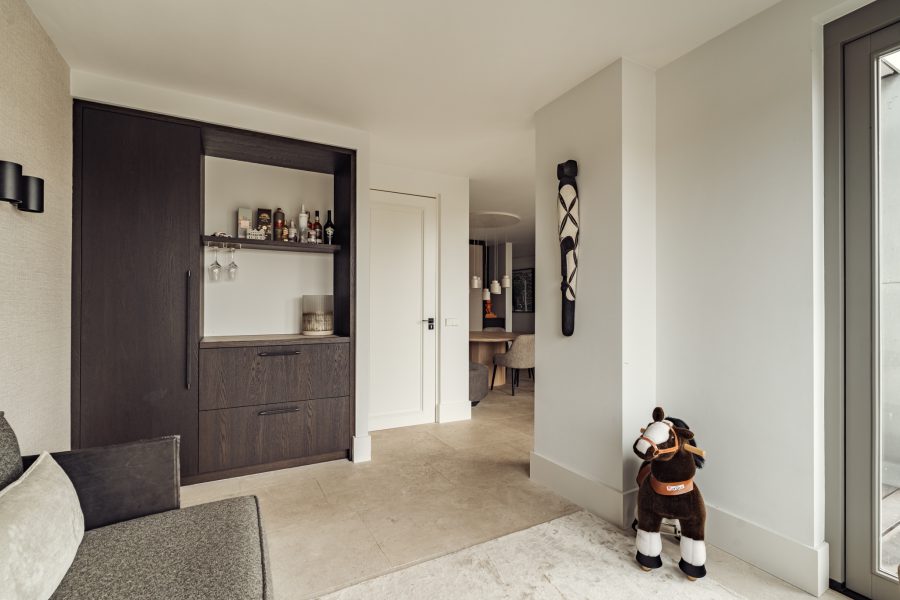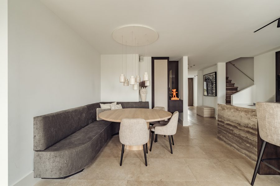 De royale eethoek met ronde maatwerktafel, en hoekbank maakt dit deel van de woning tot een warme ontmoetingsplek waar je gezellig samen kunt tafelen met familie en vrienden. Vanuit hier stap je via de openslaande deuren in de tuin, waar de luxe tuinkamer je uitnodigt om eindeloos te loungen. Met volledig open te zetten harmonicadeuren en een chique home bar waar je je eigen cocktail kunt maken, creëer je hier een waar vakantiegevoel aan huis.