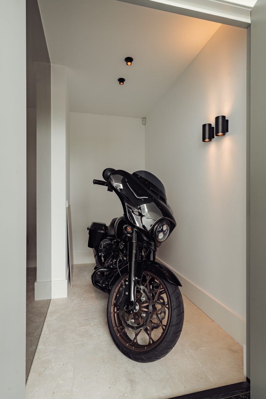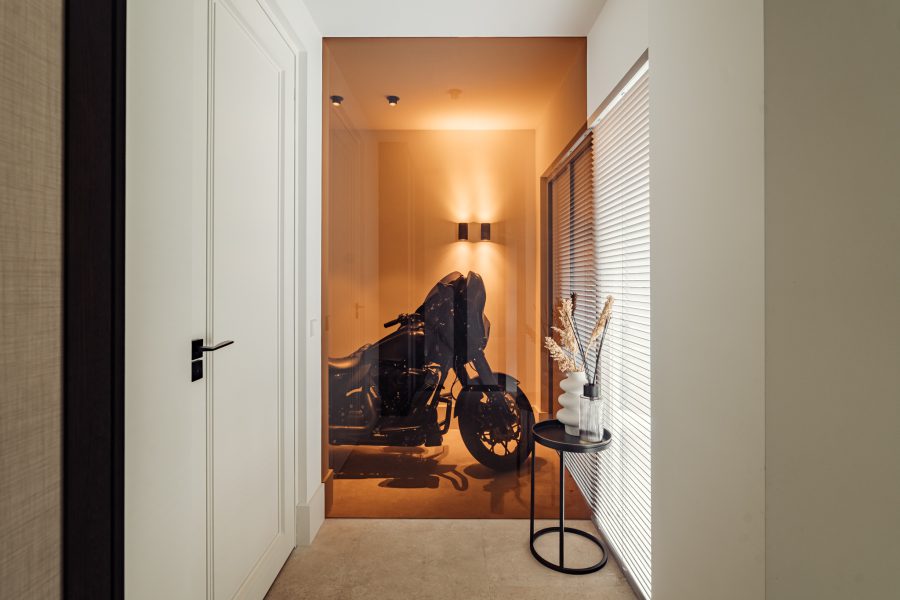 Bij binnenkomst voel je direct de sfeer van luxe: een royale garderobe en maatwerkkasten verwelkomen je in de ruime hal, voorzien van travertinvloer met vloerverwarming. Een stijlvolle rookglazen wand biedt een prachtig doorkijkje naar de berging, waar momenteel een motor staat te pronken als een waar kunstobject.