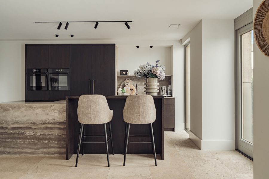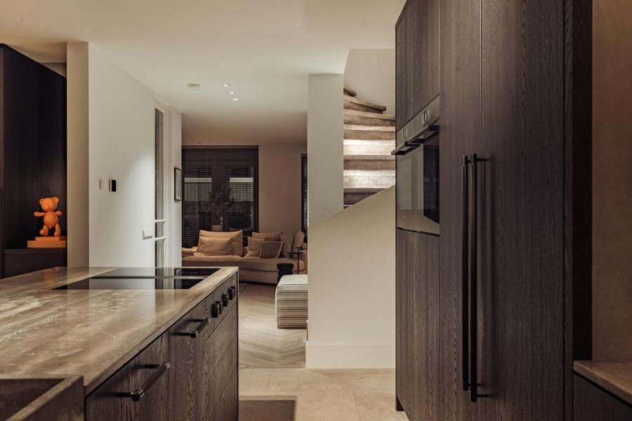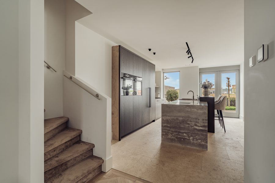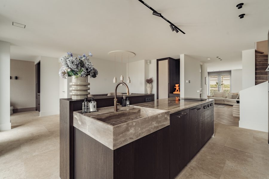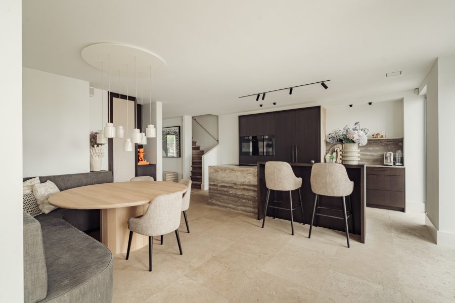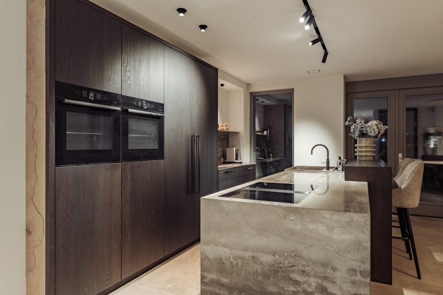 Aan de achterzijde vind je de open woonkeuken – een absoluut pronkstuk. De op maat gemaakte keuken met kookeiland heeft donkere houten fronten, een imposant marmeren blad dat doorloopt tot de grond én de spoelbak. Er is een gezellige bar met twee grote barkrukken, een stijlvolle koffiecorner en natuurlijk alle luxe apparatuur, waaronder een Quooker, een Bora Professional kookplaat met geïntegreerde afzuiging, maar liefst twee koelkasten, twee vriezers (waarvan een met ice maker!) en bovenal twee ovens, waarvan één stoomoven.
