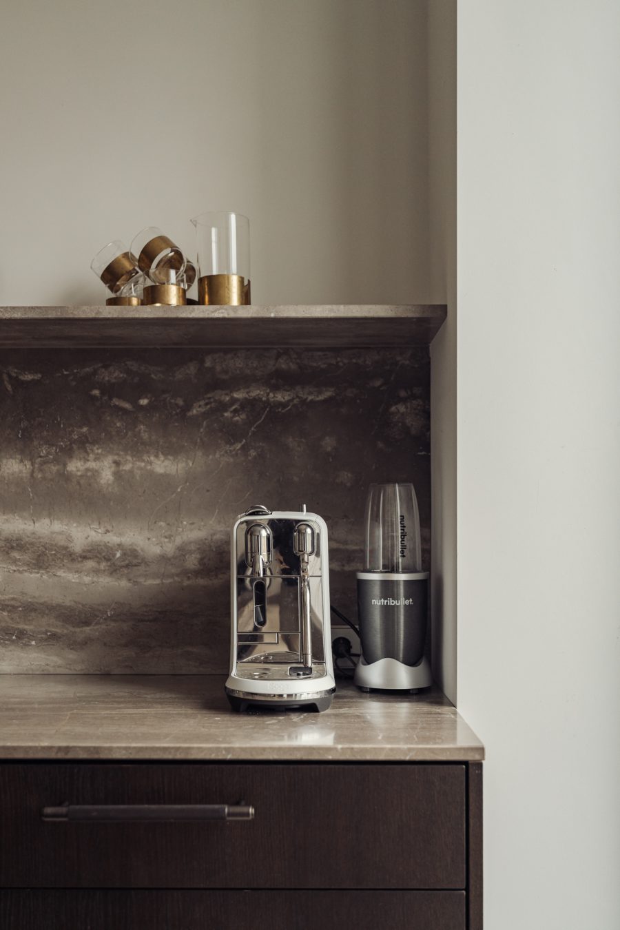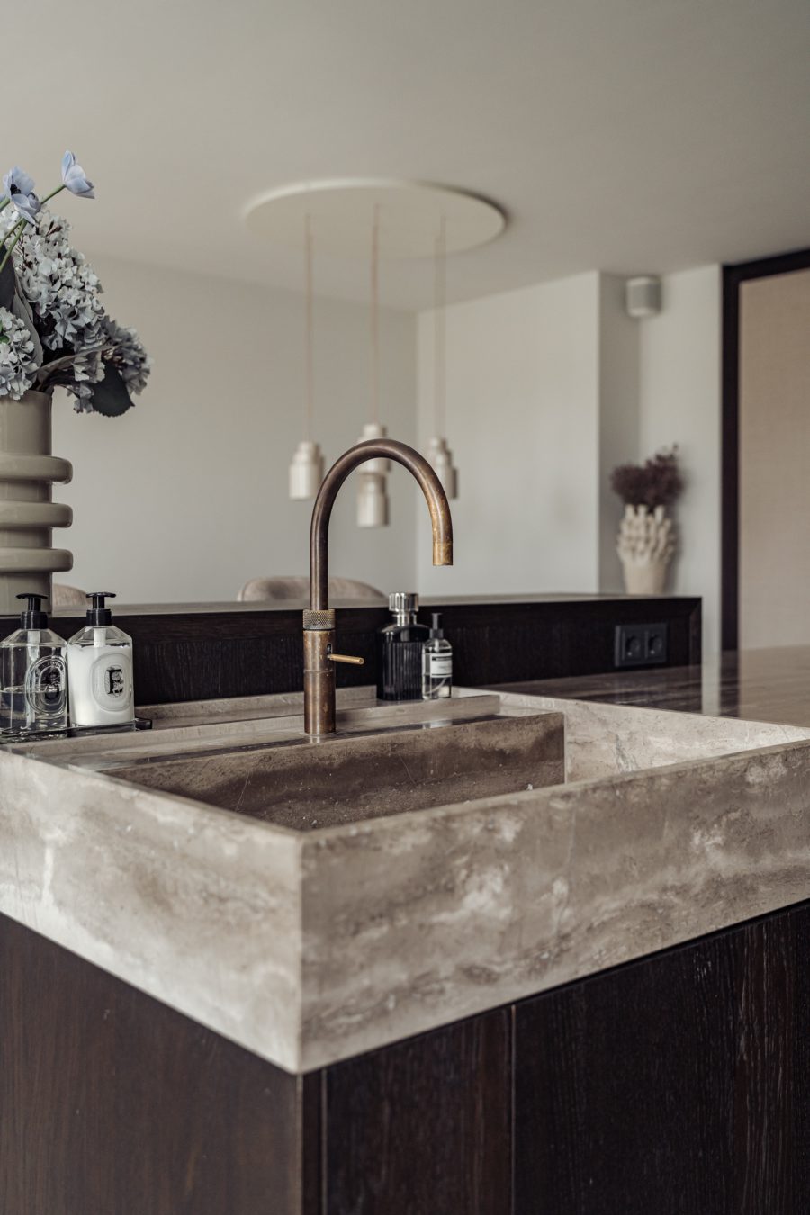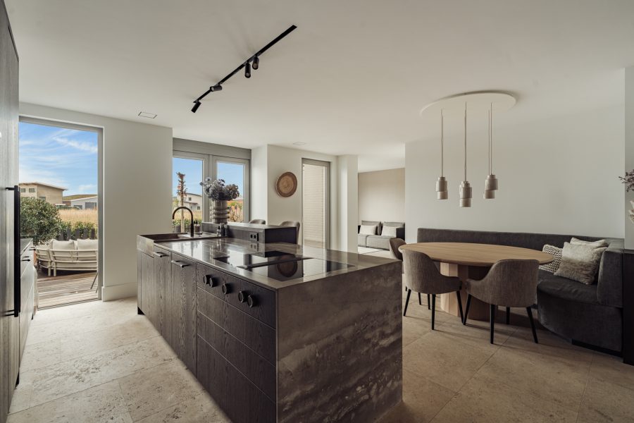 Aan de achterzijde vind je de open woonkeuken – een absoluut pronkstuk. De op maat gemaakte keuken met kookeiland heeft donkere houten fronten, een imposant marmeren blad dat doorloopt tot de grond én de spoelbak. Er is een gezellige bar met twee grote barkrukken, een stijlvolle koffiecorner en natuurlijk alle luxe apparatuur, waaronder een Quooker, een Bora Professional kookplaat met geïntegreerde afzuiging, maar liefst twee koelkasten, twee vriezers (waarvan een met ice maker!) en bovenal twee ovens, waarvan één stoomoven.