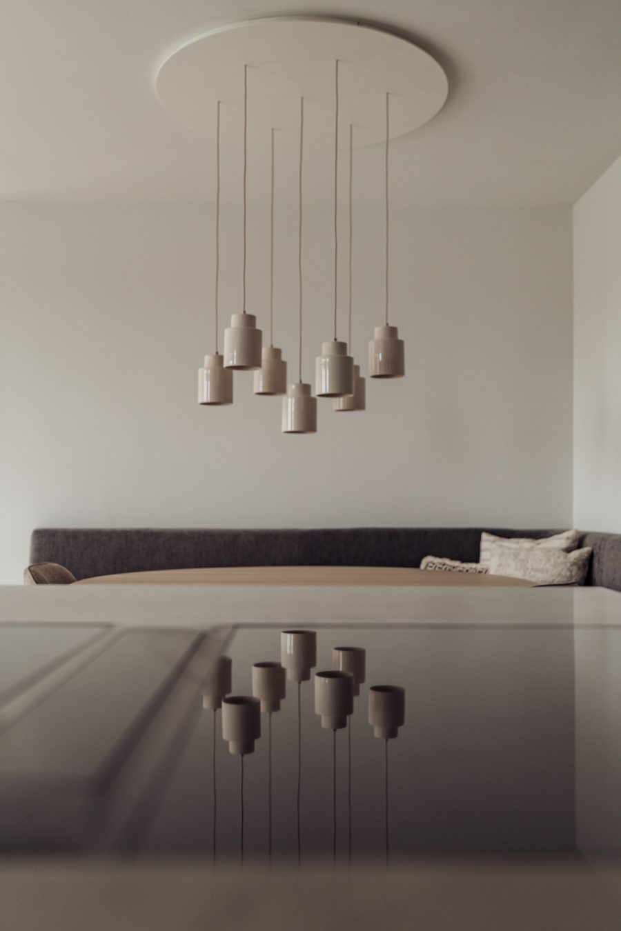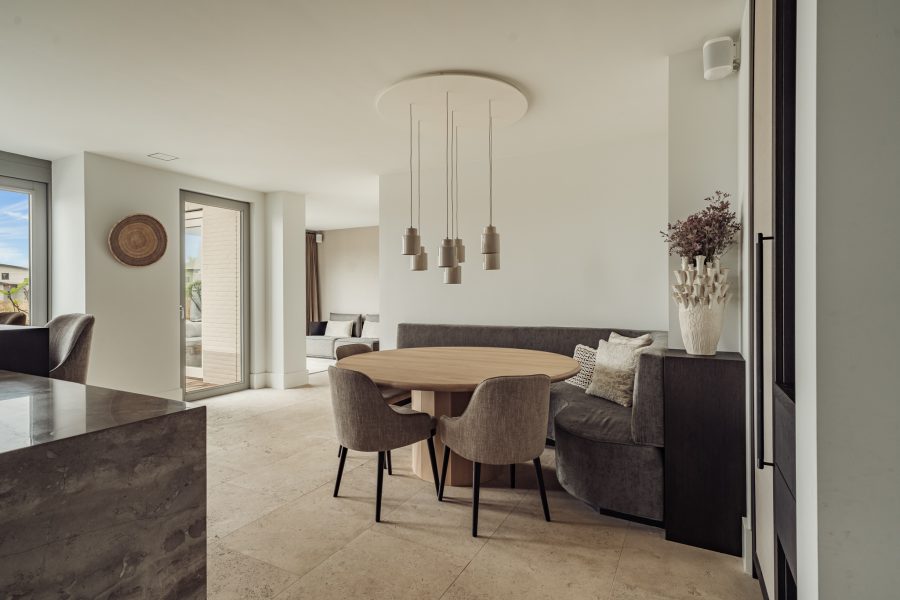 The spacious dining area with a round custom-made table and corner sofa makes this part of the house a warm gathering place where you can dine with family and friends. From here, you step out through French doors into the garden, where the luxurious garden room invites you to lounge endlessly. With fully retractable folding doors and a chic home bar where you can make your own cocktails, you create a true vacation feeling at home.