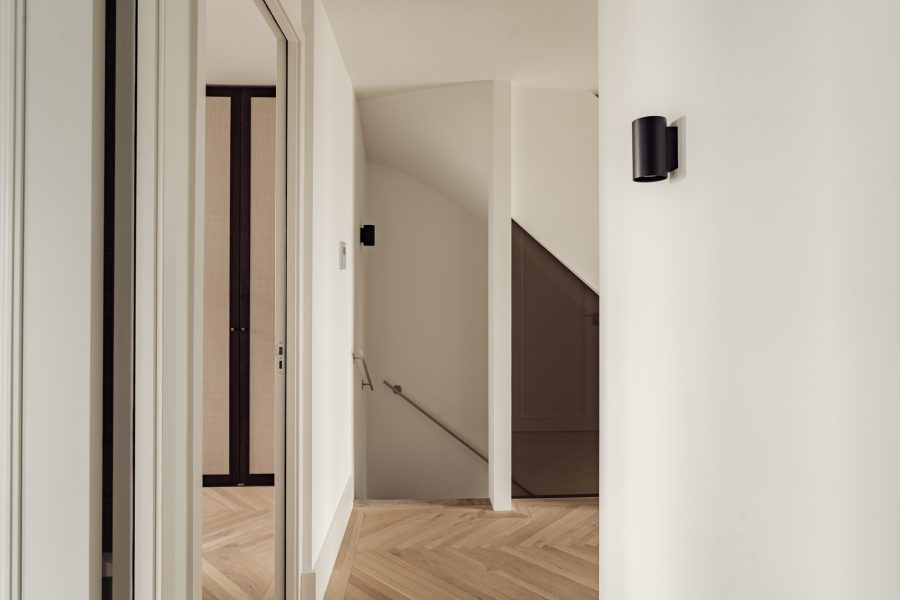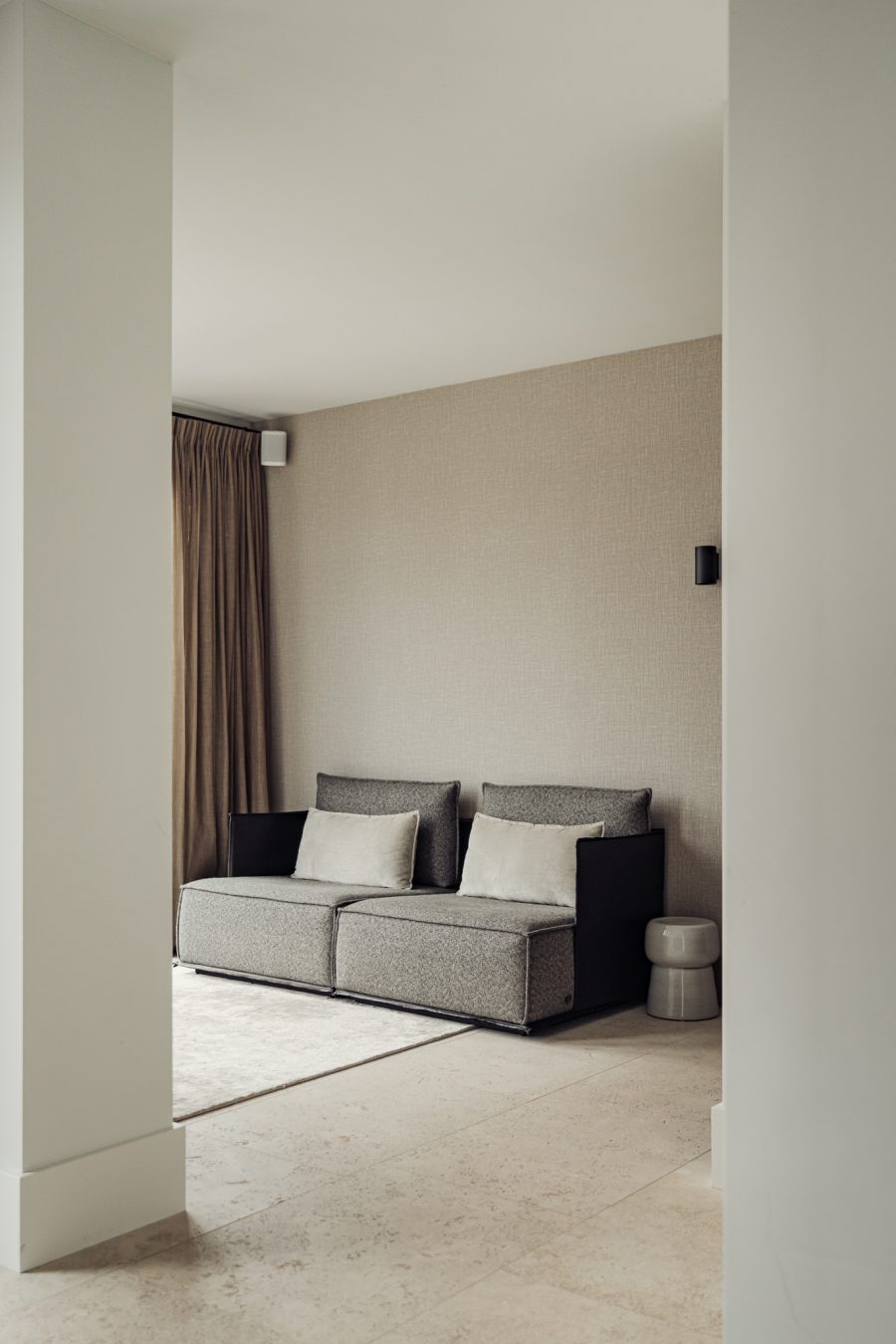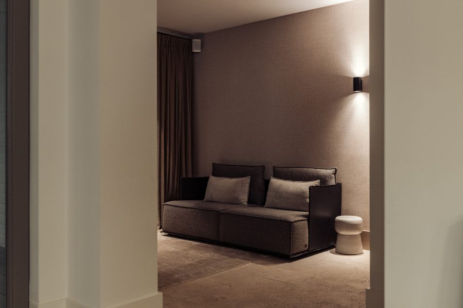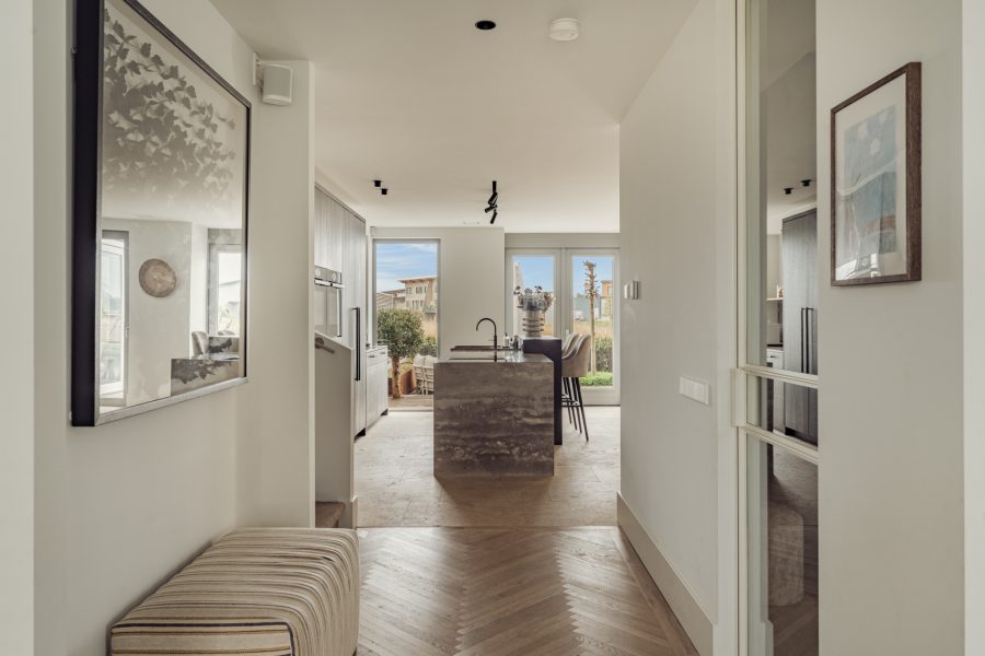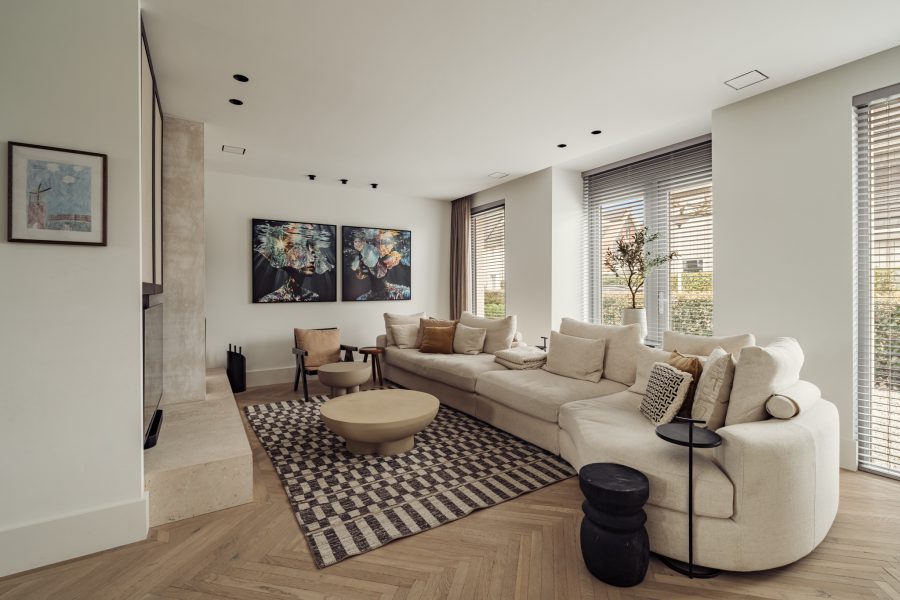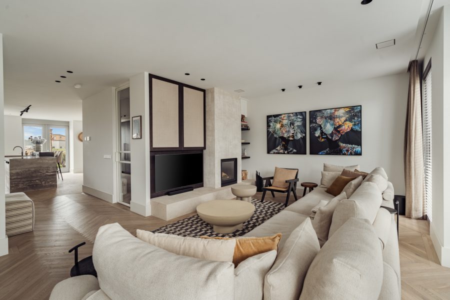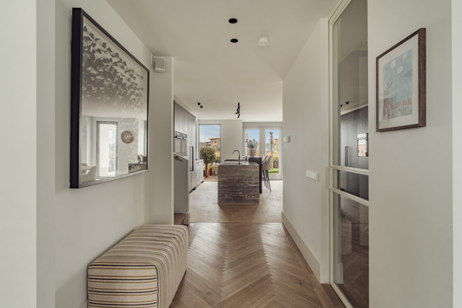 Through a white steel door, you step into the expansive living room. At the front, there’s a cozy seating area with a cinewall, a real wood-burning fireplace, and French doors leading to the front garden. The stunning herringbone wooden floor, custom cabinets, and elegant finishes create a setting where atmosphere and class come together. It leaves you momentarily speechless.