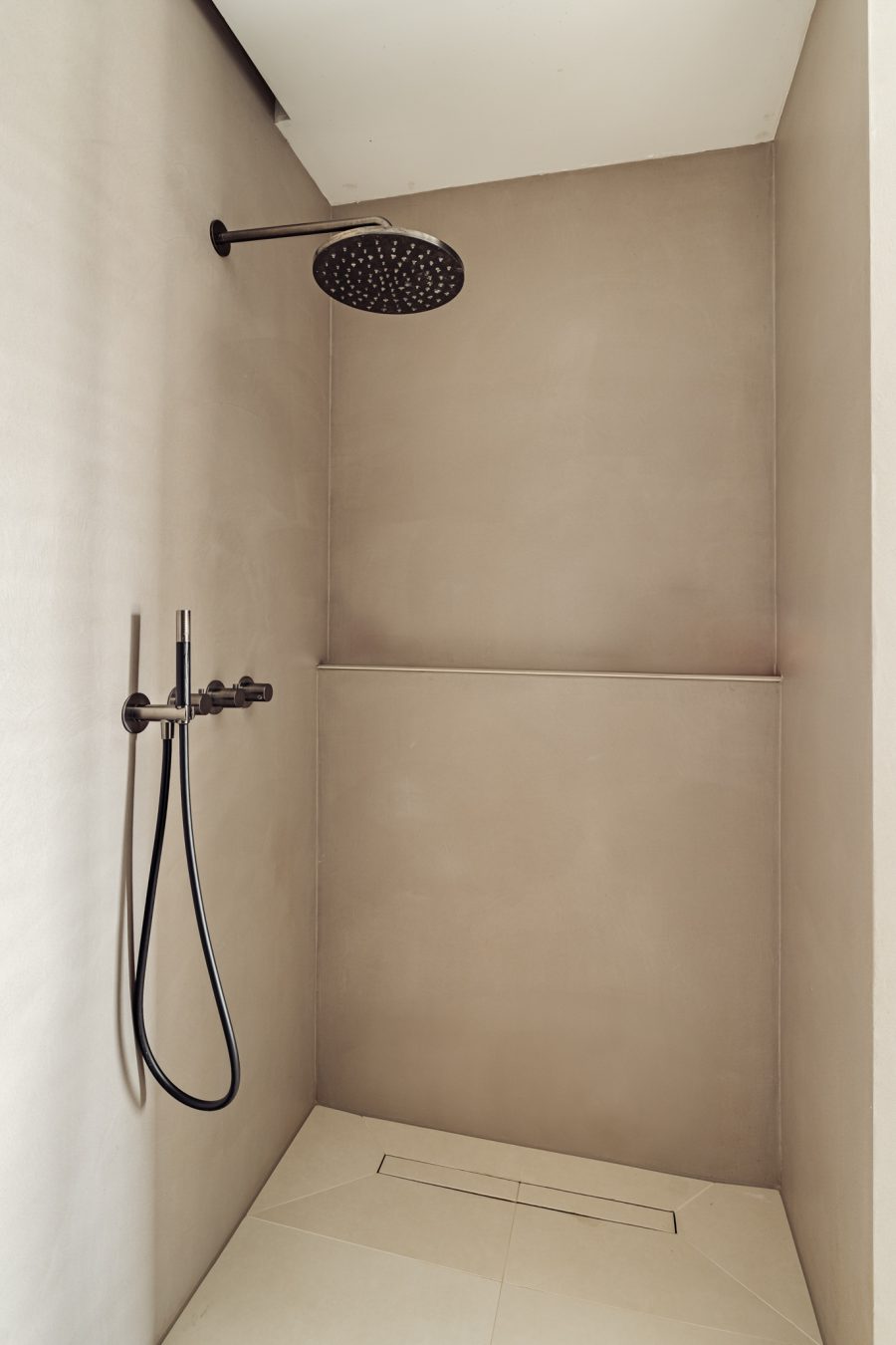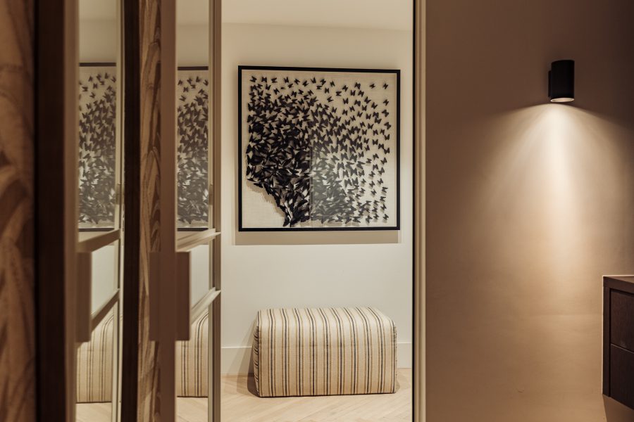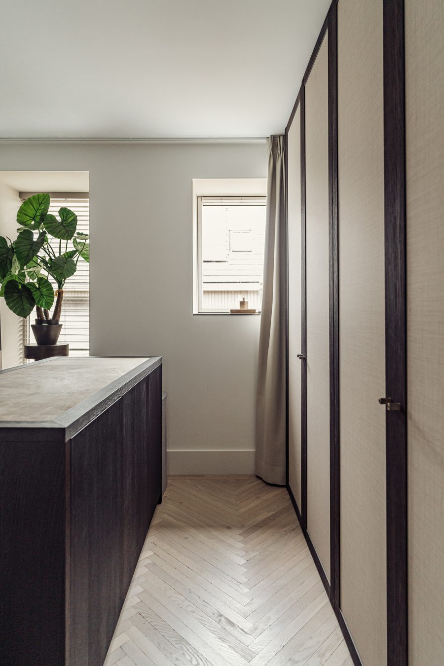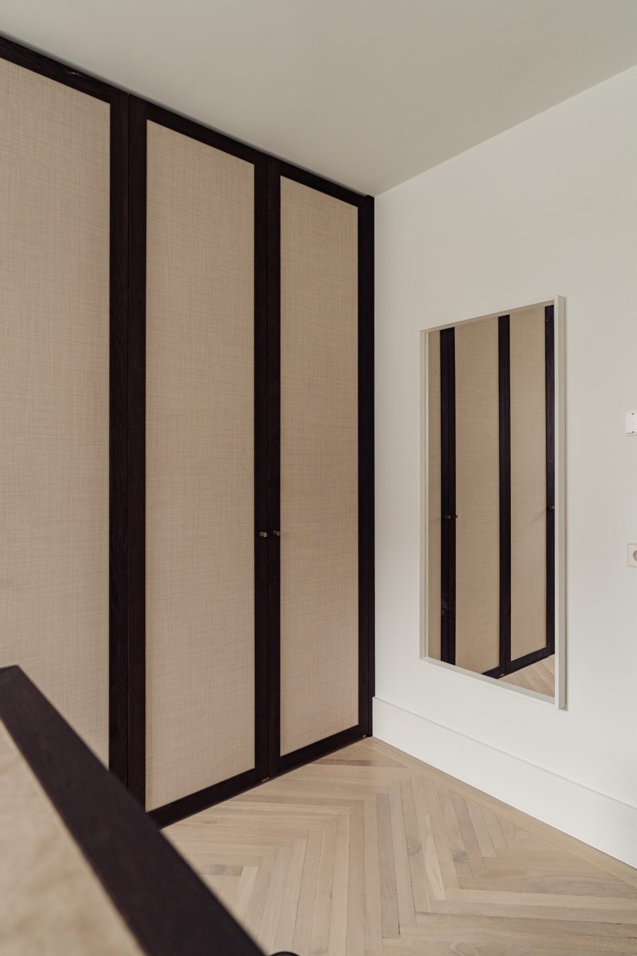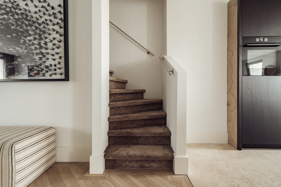 Through a white steel door, you step into the expansive living room. At the front, there’s a cozy seating area with a cinewall, a real wood-burning fireplace, and French doors leading to the front garden. The stunning herringbone wooden floor, custom cabinets, and elegant finishes create a setting where atmosphere and class come together. It leaves you momentarily speechless.