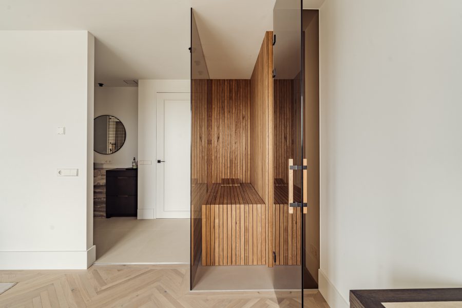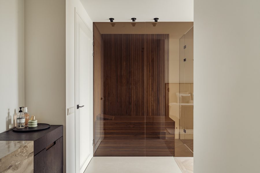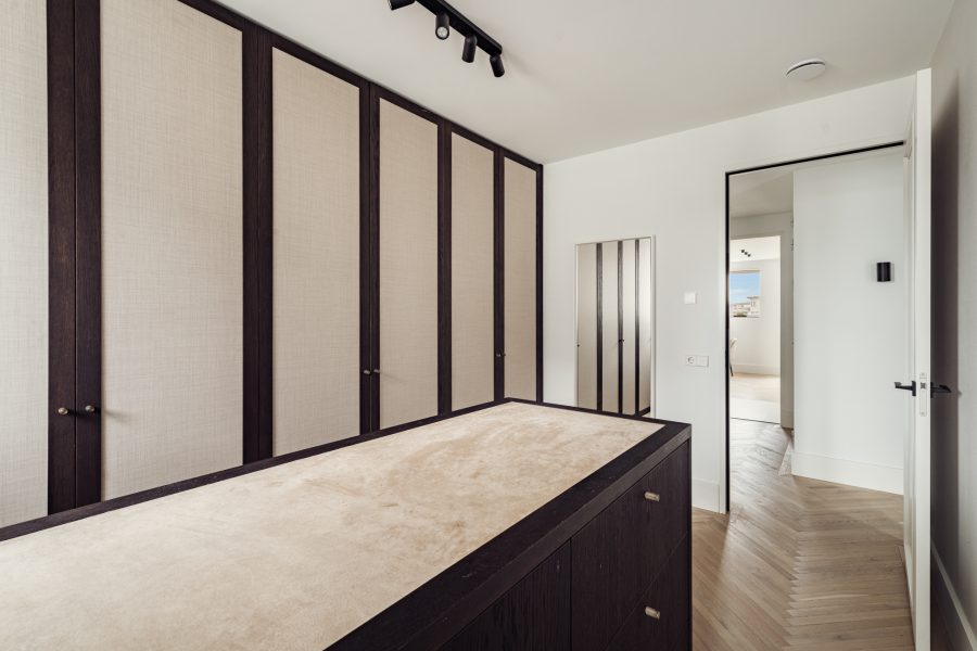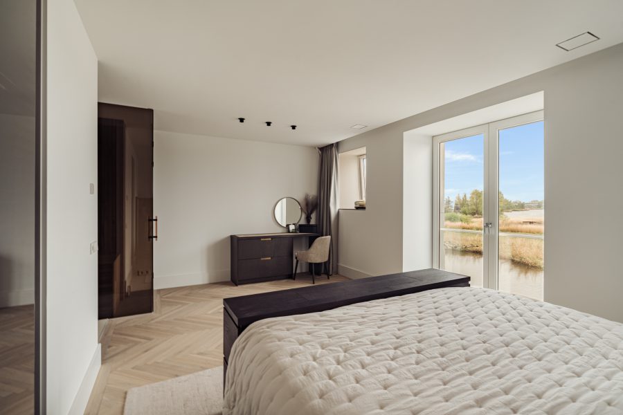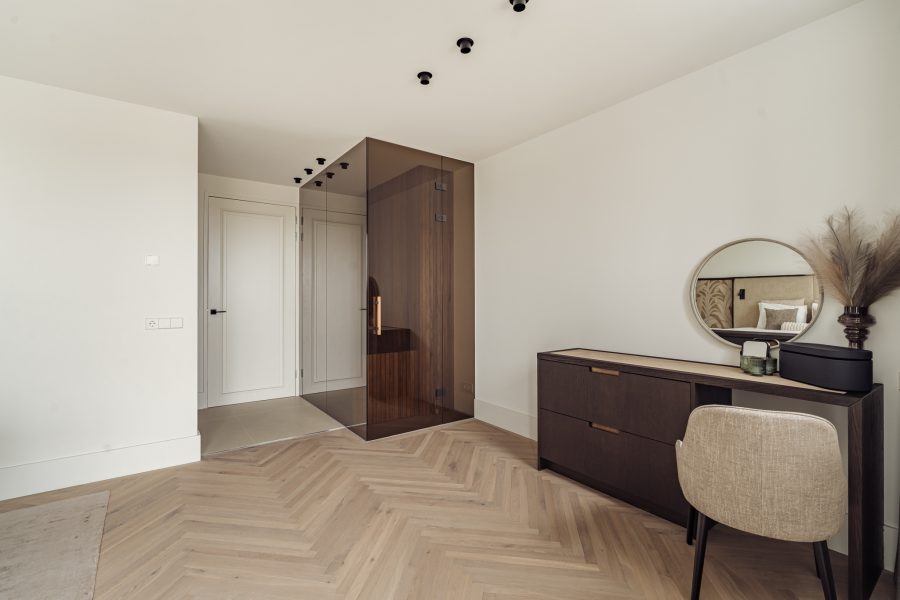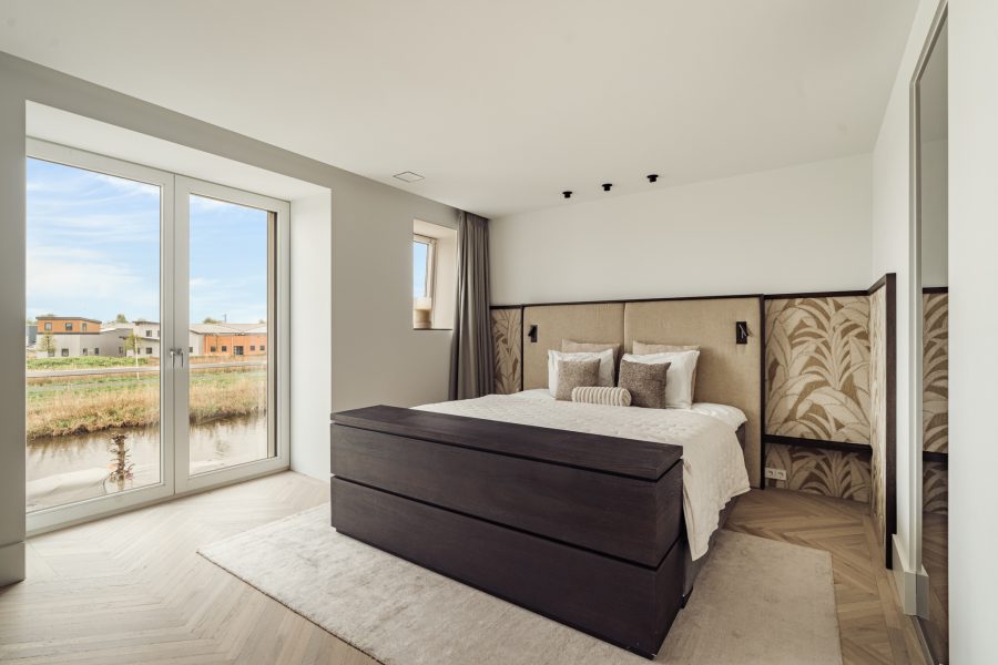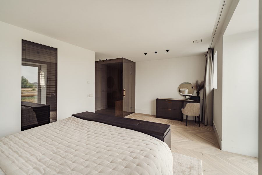 The staircase, covered with luxurious carpet, leads you to the first floor with a herringbone wooden floor. Here, two bedrooms are located at the front, one of which is set up as a "dream walk-in closet" with custom cabinetry. At the back, you’ll find the master bedroom: a hotel-chic suite with custom furniture, a television that rises from the bed, and a view over the water. The open bathroom with beautiful materials features a large bathtub, a walk-in shower with a smoked glass door, and the integrated sauna with a glass wall elevates this space to extraordinary heights. You truly feel like you’re in a fantastic hotel here.