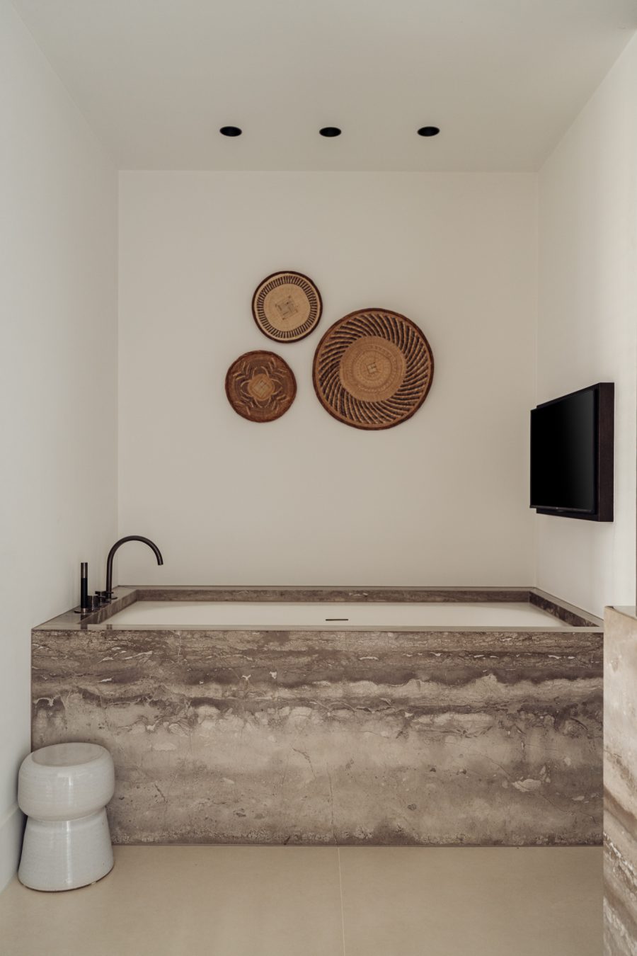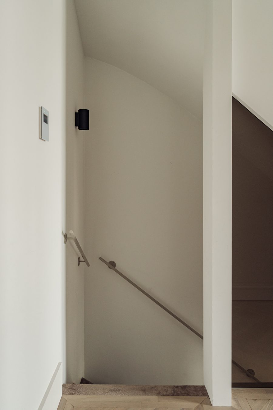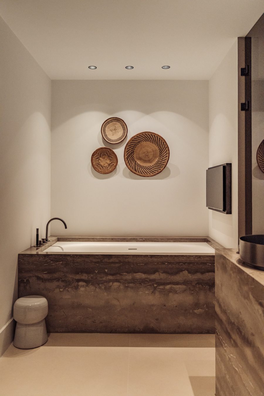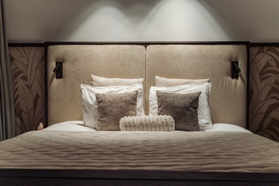 The staircase, covered with luxurious carpet, leads you to the first floor with a herringbone wooden floor. Here, two bedrooms are located at the front, one of which is set up as a "dream walk-in closet" with custom cabinetry. At the back, you’ll find the master bedroom: a hotel-chic suite with custom furniture, a television that rises from the bed, and a view over the water. The open bathroom with beautiful materials features a large bathtub, a walk-in shower with a smoked glass door, and the integrated sauna with a glass wall elevates this space to extraordinary heights. You truly feel like you’re in a fantastic hotel here.