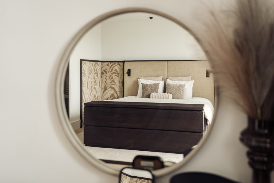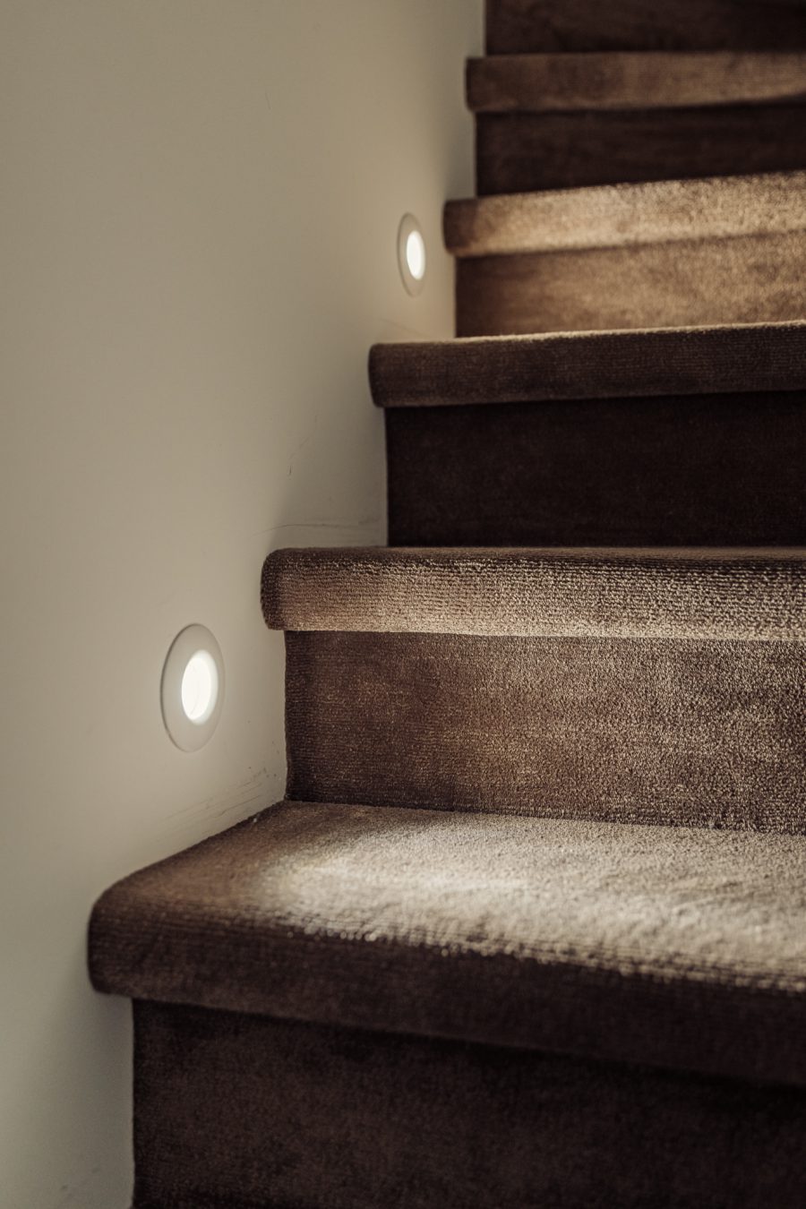 De trap, bekleed met luxe tapijt, leidt je naar de eerste verdieping met visgraat houten vloer. Hier zijn twee slaapkamers aan de voorzijde, waarvan één ingericht als “droom van een inloopkast” met maatwerk kastenwanden. Aan de achterzijde vind je de master bedroom: een hotel-chique suite met maatwerk meubels, een televisie die uit het bed omhoog komt en een uitzicht over het water. De open badkamer met prachtige materialen is voorzien van een heerlijk groot ligbad, inloopdouche met rookglazendeur. De geïntegreerde sauna met glazen wand tilt deze ruimte naar ongekende hoogten. Je waant je hier echt in een fantastisch hotel.