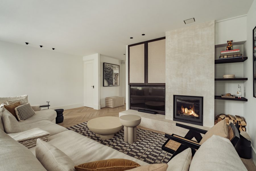 • Riante woonkamer met cinewall, gezellige houtgestookte haard en maatwerk kasten