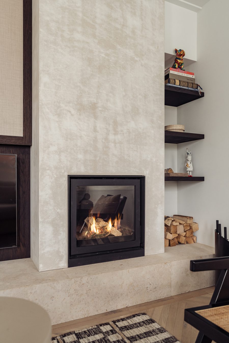 Via een witstalen deur stap je de riante woonkamer binnen. Aan de voorzijde is een sfeervolle zithoek met cinewall, een echte houtgestookte haard en openslaande deuren naar de voortuin. De schitterende visgraat houten vloer, de maatwerkkasten en de elegante afwerking creëren een setting waar sfeer en klasse samenkomen. We worden er even stil van.