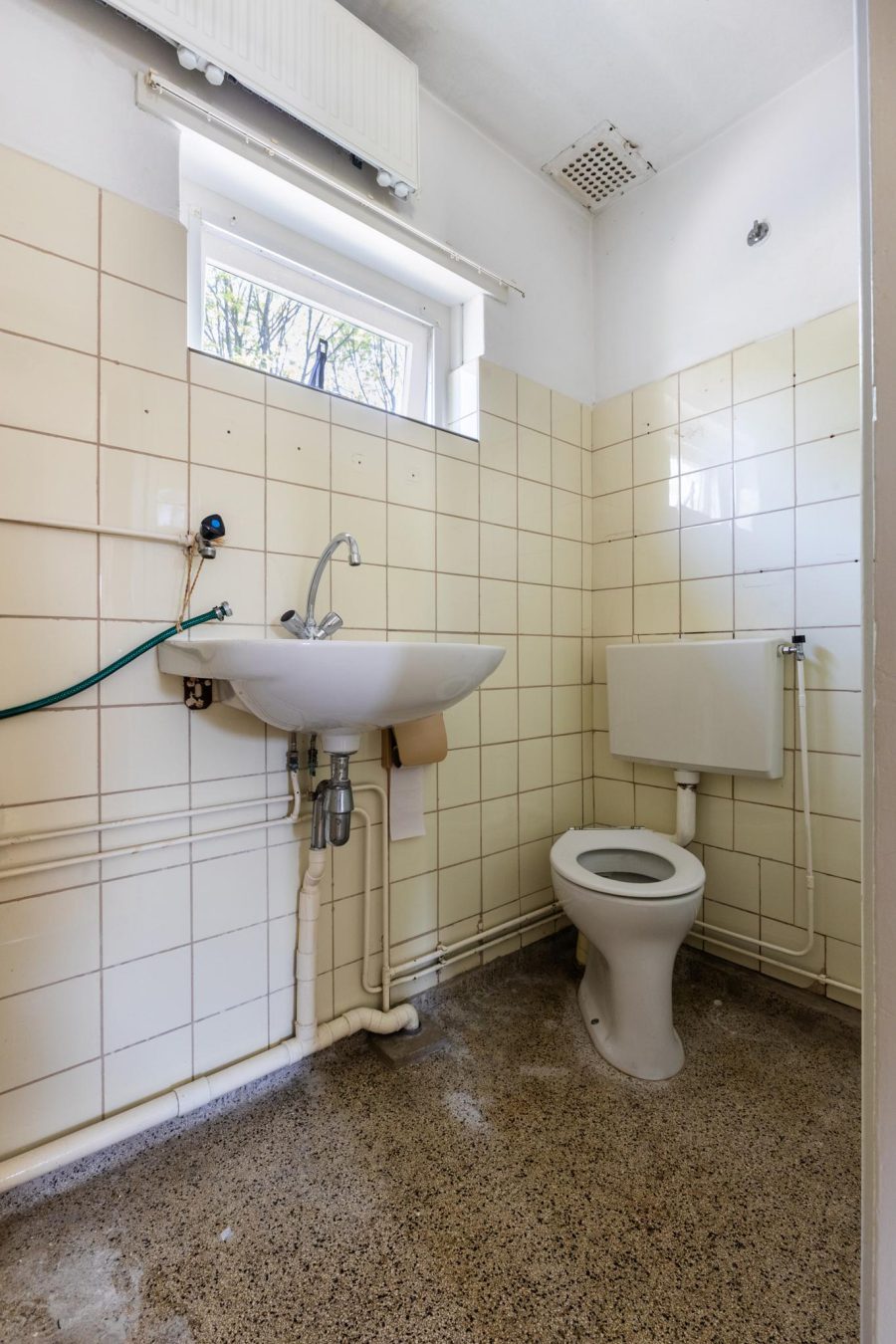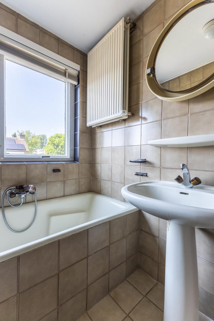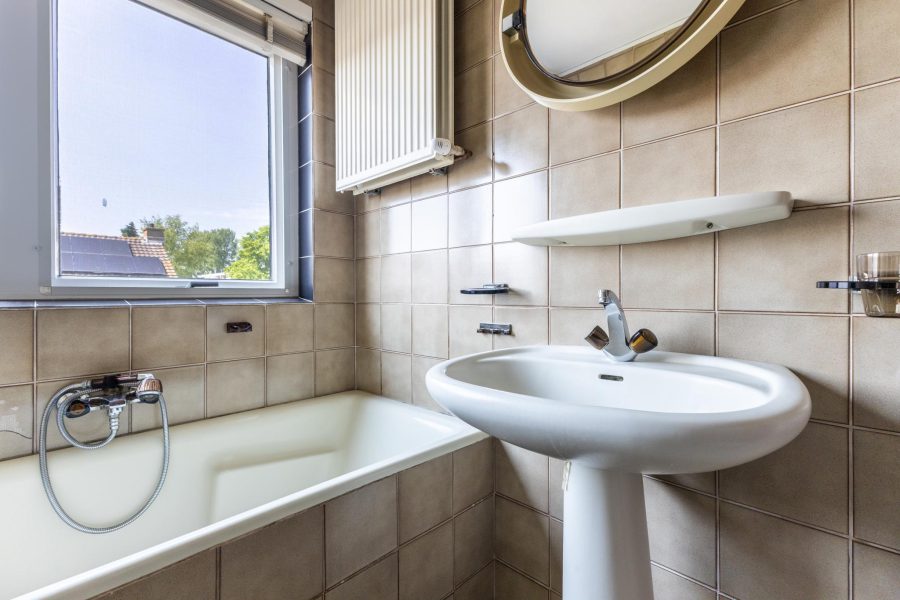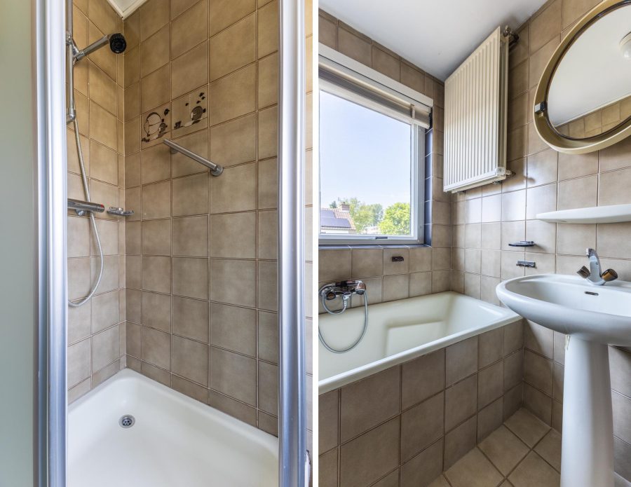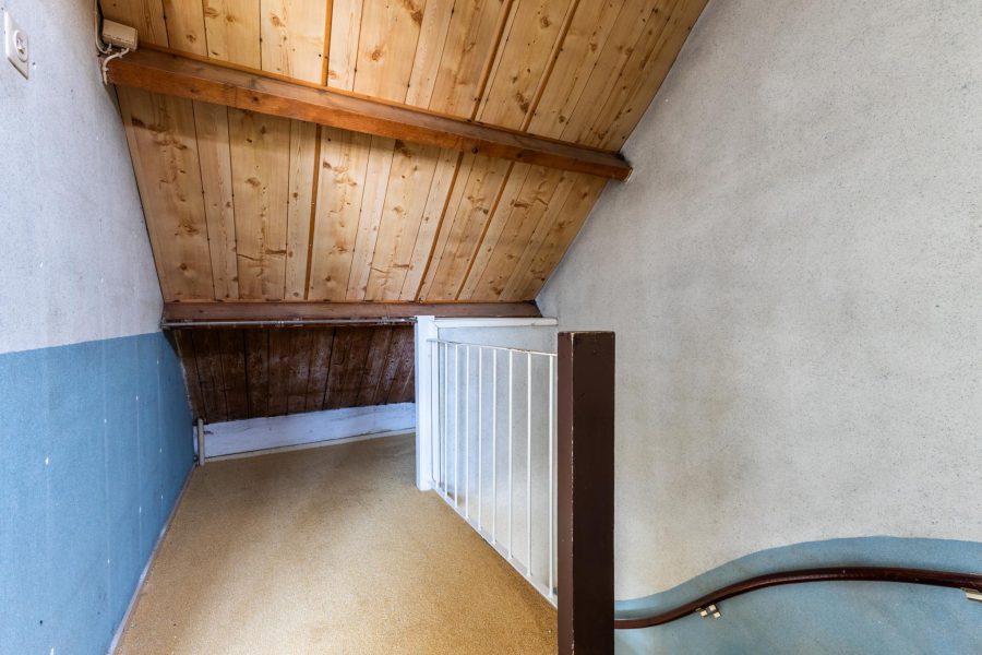 Via the upholstered staircase, we reach the landing of this floor. Here you will find two spacious, bright bedrooms, a separate toilet and the bathroom. One bedroom is at the front and has a fixed sink, the second bedroom is at the back, next to the bathroom. The bathroom (in need of updating) has a washbasin with mirror, a bathtub and a shower cabin.