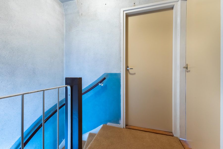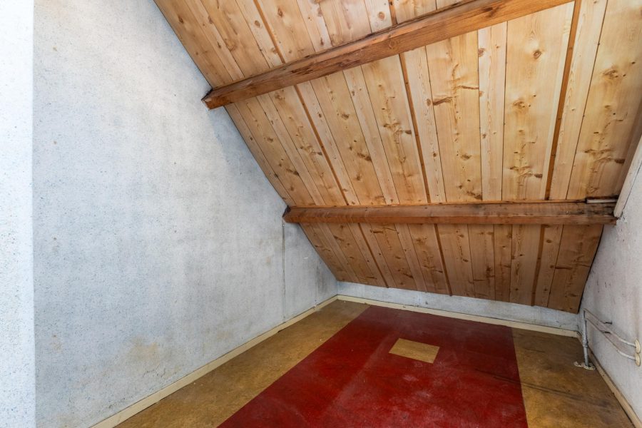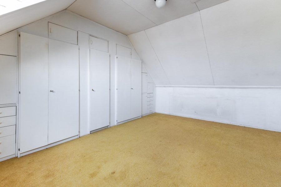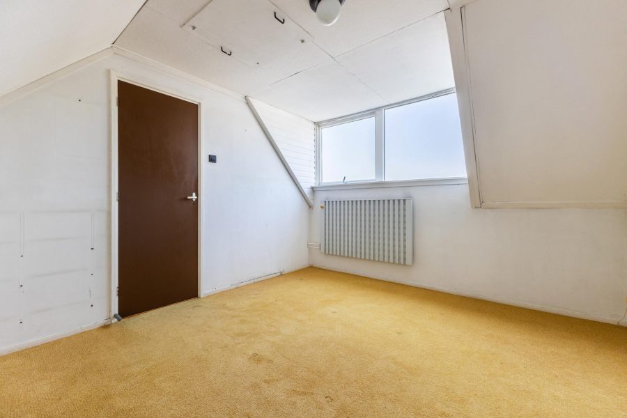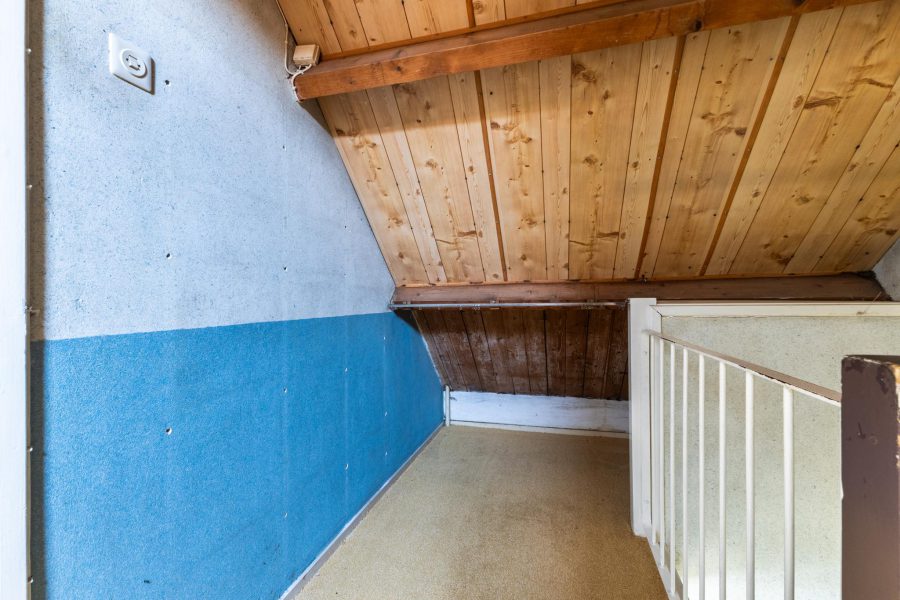 Via a fixed staircase, we reach the landing of this floor. Here we find a lot of storage space and a spacious third bedroom. This bedroom has a dormer window at the back and closet space. This floor is yet to be insulated.