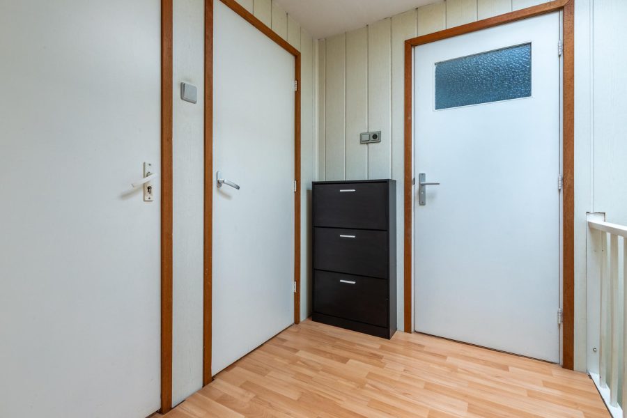Via the crescent-lined staircase, we reach the landing of this floor. Here we find three bedrooms and the bathroom. Two bedrooms are located at the rear. The third bedroom is at the front, next to the bathroom. All bedrooms have wide windows and a nice light. The bathroom has a vanity unit with washbasin and mirror, recessed spotlights and a corner bath with shower. On the floor of this floor is laminate and the rooms are nicely finished.