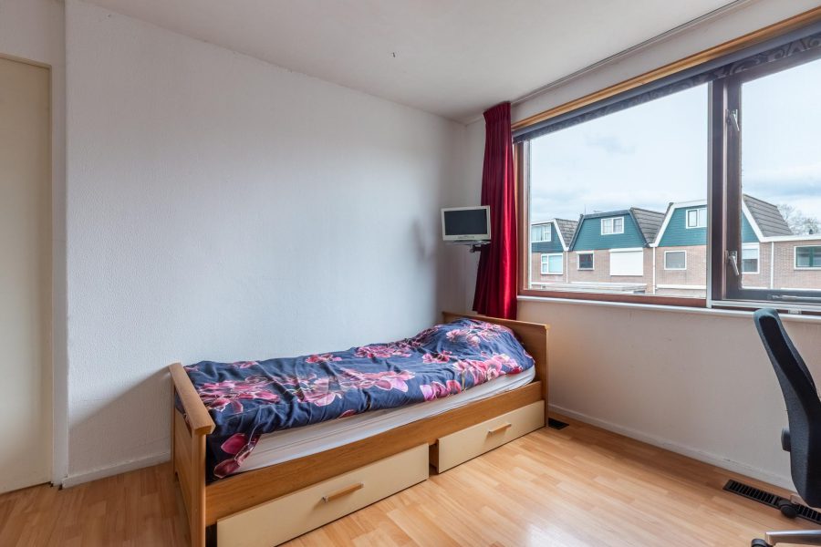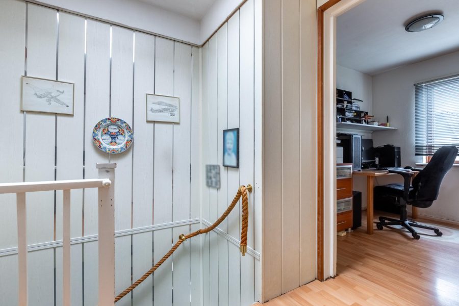 Via de met halvemaantjes beklede trap bereiken we de overloop van deze verdieping. Hier treffen we drie slaapkamers en de badkamer aan. Twee slaapkamers liggen aan de achterzijde. De derde slaapkamer ligt aan de voorzijde, naast de badkamer. Alle slaapkamers hebben brede raampartijen en een mooie lichtinval. In de badkamer tref je een badmeubel met wastafel en spiegel, inbouwspots en een hoekligbad met douche aan. Op de vloer van deze verdieping ligt laminaat en de kamers zijn netjes afgewerkt.