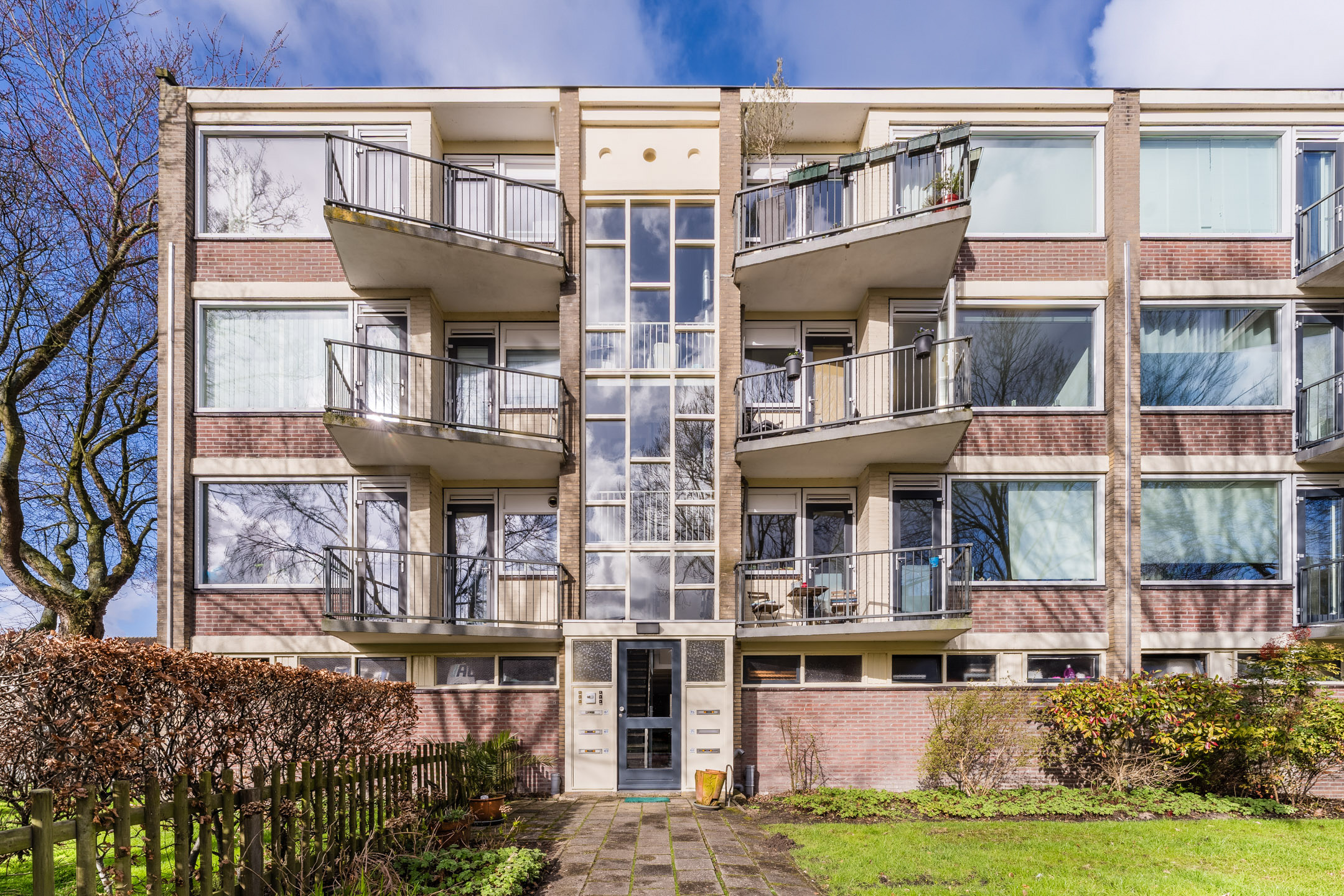 Gesloten entree met bellentableau en brievenbussen.
